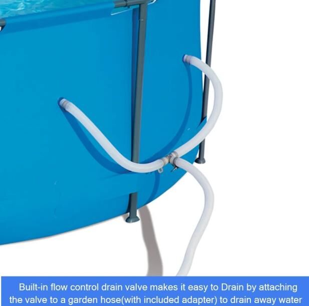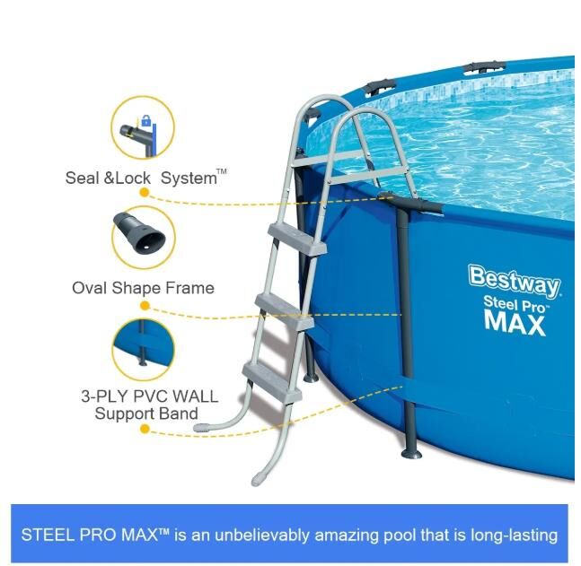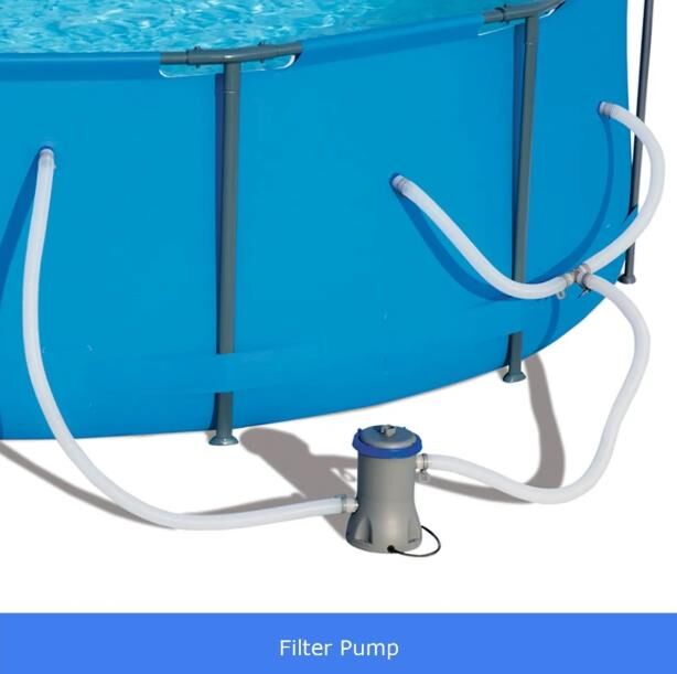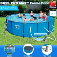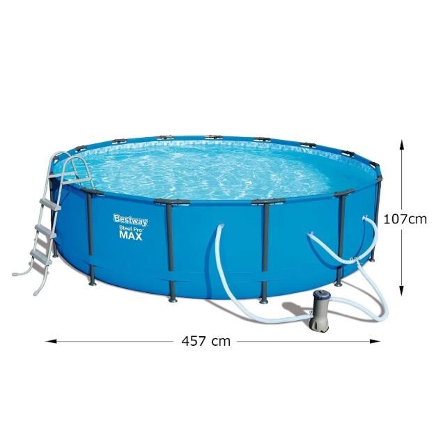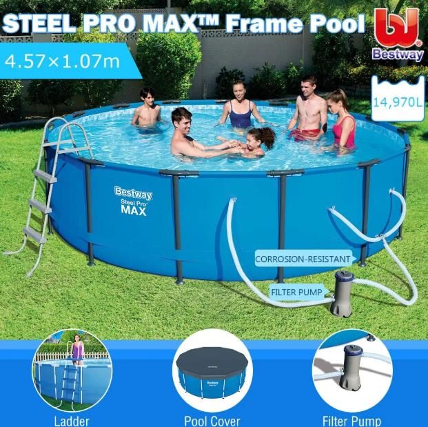 Enjoy swimming in this Bestway 4.57M Above Ground Metal Frame Swimming Pool w/Ladder & Filter Pump with your family and friends in your own backyard this summer. This 4.57m x 1.07m pool, with water capacity of 14,970 liters, is pretty big enough for outdoor summer pool party. Made of corrosion resistant metal frame, this above ground swimming pool can last for years with proper maintenance. Featuring heavy-duty PVC, polyester 3-ply side walls and 3-ply wall band , this swimming pool is puncture resistant, UV resistant and highly secure. This above ground pool is also reinforced with rope wraps around the bottom of the pool to keep the legs firmly in position. The convenient flow control drain valve with the included adapter can attach to your garden hose, so water can be drained away from pool area easily. And make cleaning and storing the pool a breeze. Complete accessories included. This cheap swimming pool also comes equipped with a ground cloth and a heavy-duty repair patch for additional protection, a handy pool ladder for easy access, a durable pool cover for keeping away from dirty and other debris. Buy the best above ground pool now, you'll get an installation guide to assist you in setting up this swimming pool.