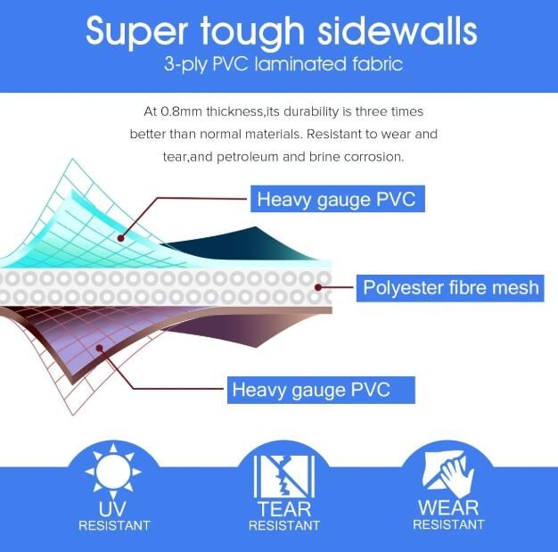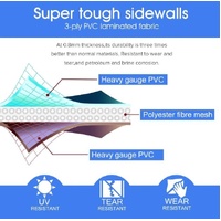 Extra strong side walls are made with 3 separate layers of material. The inner layer of polyester mesh is laminated to the 2-outer heavy gauge PVC layers.