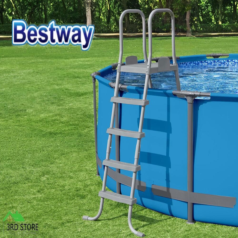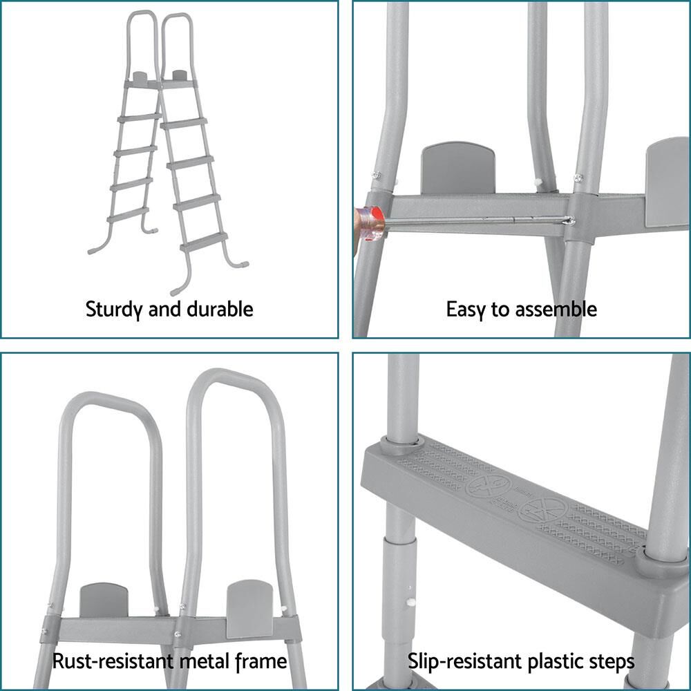 Bestway Pool Ladder 195CM Featuring heavy duty plastic steps that are non-slip and removable, the pool ladder is made froma white metal frame to provide stability.