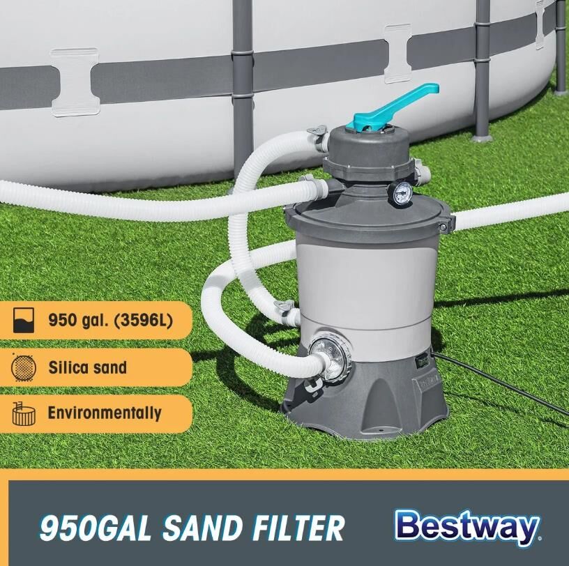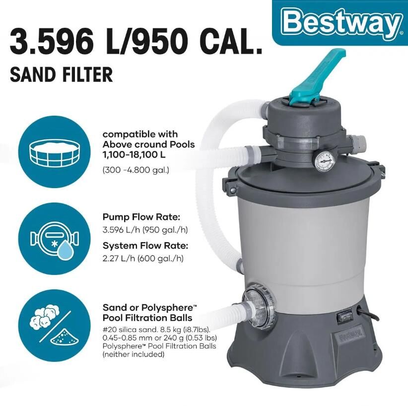 - The Bestway® 950 gal. (3596 L) Flowclear™ Sand Filter is a highly efficient and environmentally friendly way to keep clean water flowing through your above ground pool.