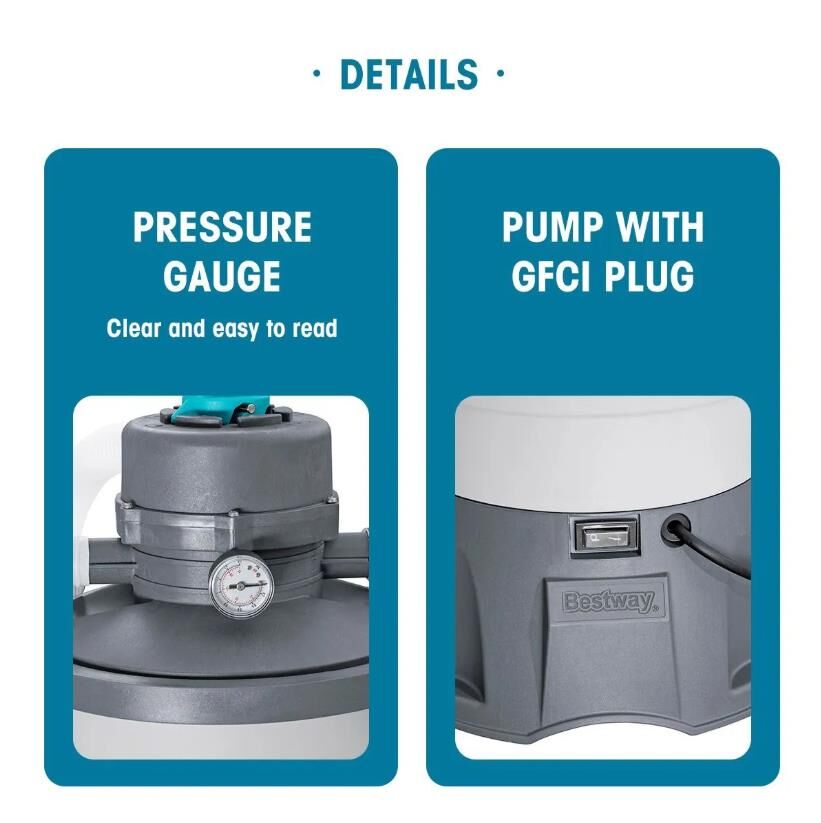 Keep your swimming pool water crystal clear and sparkling with the Bestway Flowclear Sand Filter Pump. This sand filter includes a durable filter tank, a pump, top flange clamps, a dispenser, a pressure gauge and a six-position valve. It is an ultra-quiet, energy-saving pool sand filter pump. The pool pump filter generates a flow rate of 950 gallons per hour providing excellent pool filtration. The pump dispenser provides clean and healthy pool water while another dispenser releases a stable level of chlorine for proper chemical balance. The pool filter system is suitable for swimming pools of up to 4800 gallons. For a low-maintenance above ground pool management, the Bestway sand filter is a reliable solution.