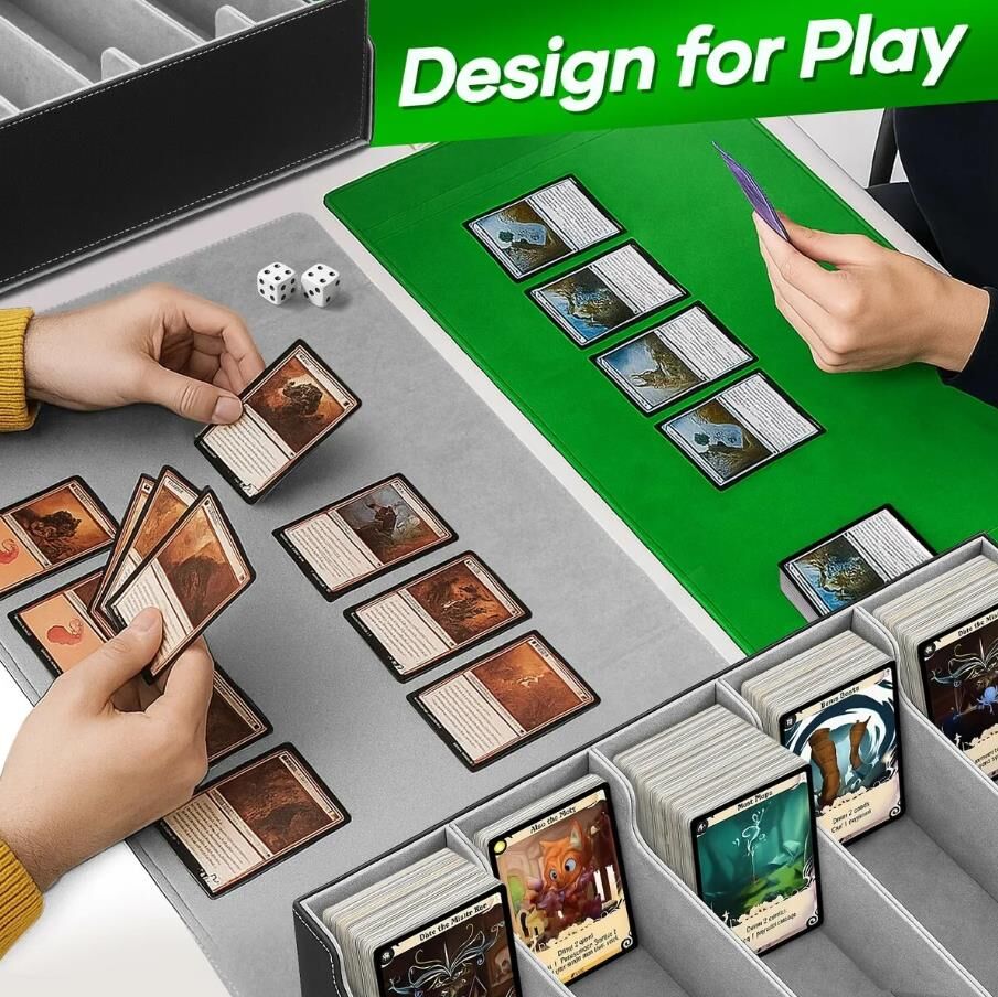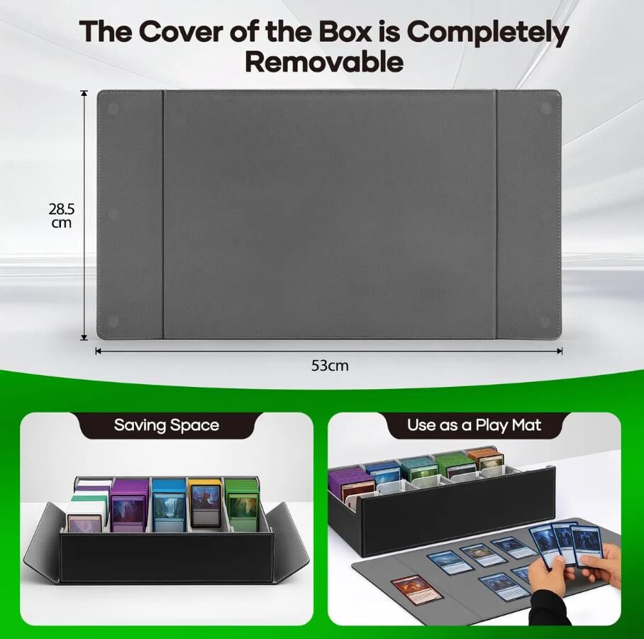 This extra-large 3800+ card deck box will keep your cards neat and in order. With an upgraded 5-row layout, this trading card storage box holds over 3800 unsleeved cards, 2200 single-sleeved cards, or 1800 double-sleeved cards. Finely made of durable, water-resistant faux PU leather with a soft fabric interior, this MTG deck box provides exceptional protection against scratches, creases and other damage. Moreover, this kit has a removable magnetic cover that can be placed underneath to save space or used as a playmat during games. Perfect for gathering Magic, MTG, TCG, PTCG, football, baseball or other sports cards, this card box features five card stoppers to keep cards upright and organised and 20 colourful removable dividers for easy sorting and categorisation. Enjoy card games with your family or friends using this large-capacity card storage organiser.