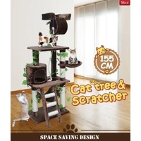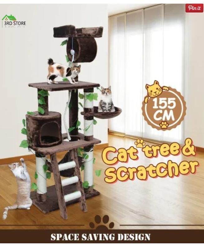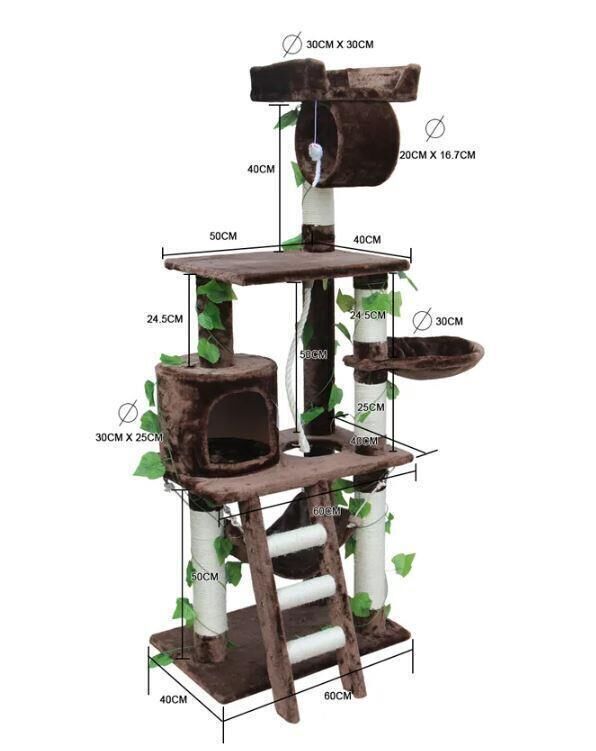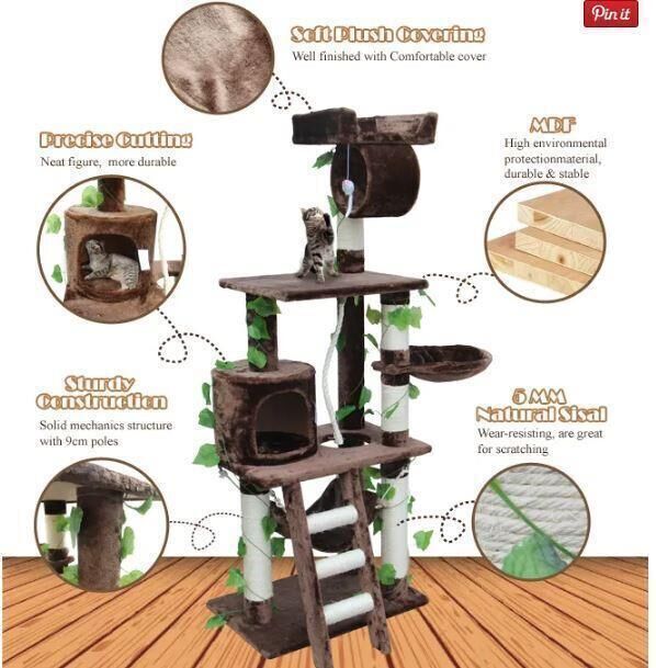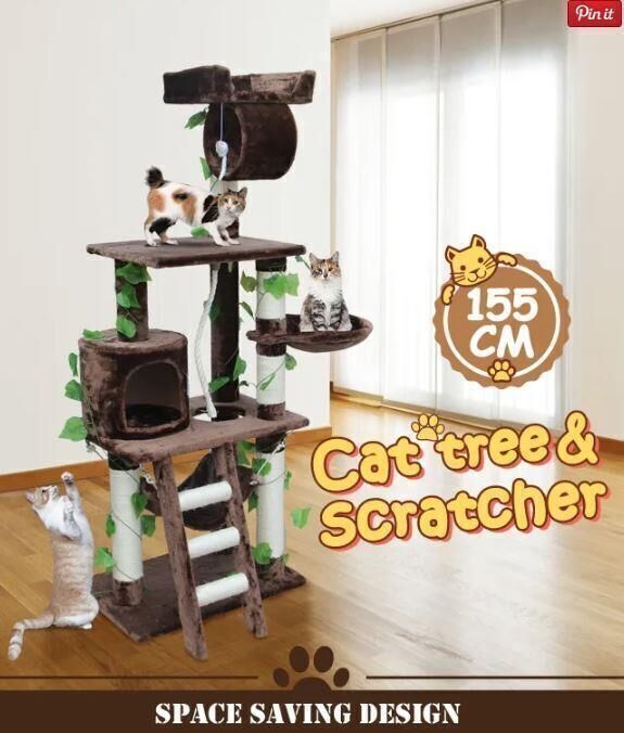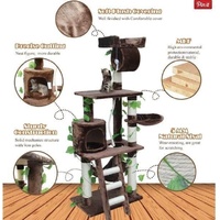 Your favourite feline friend will love this 155cm Cat Gym Scratching Post Tree Medium Mocha! Ideal for growing kittens to perfect their agility and sharpen their claws or for pampered indoor cats to get the exercise they need; your furniture will be safe from bored or angry cats. The sturdy construction and plush sisal materials provide comfort for cats whether they choose to play or relax. Featuring 1 house for hiding, 1 tunnel, 1 hammock, 1 condo, support poles which double as scratching posts and 4 perching stands for your cat to relax or keep watch of the environment, this cat gym will keep your cat or cats in perfect shape and entertained for hours on end.