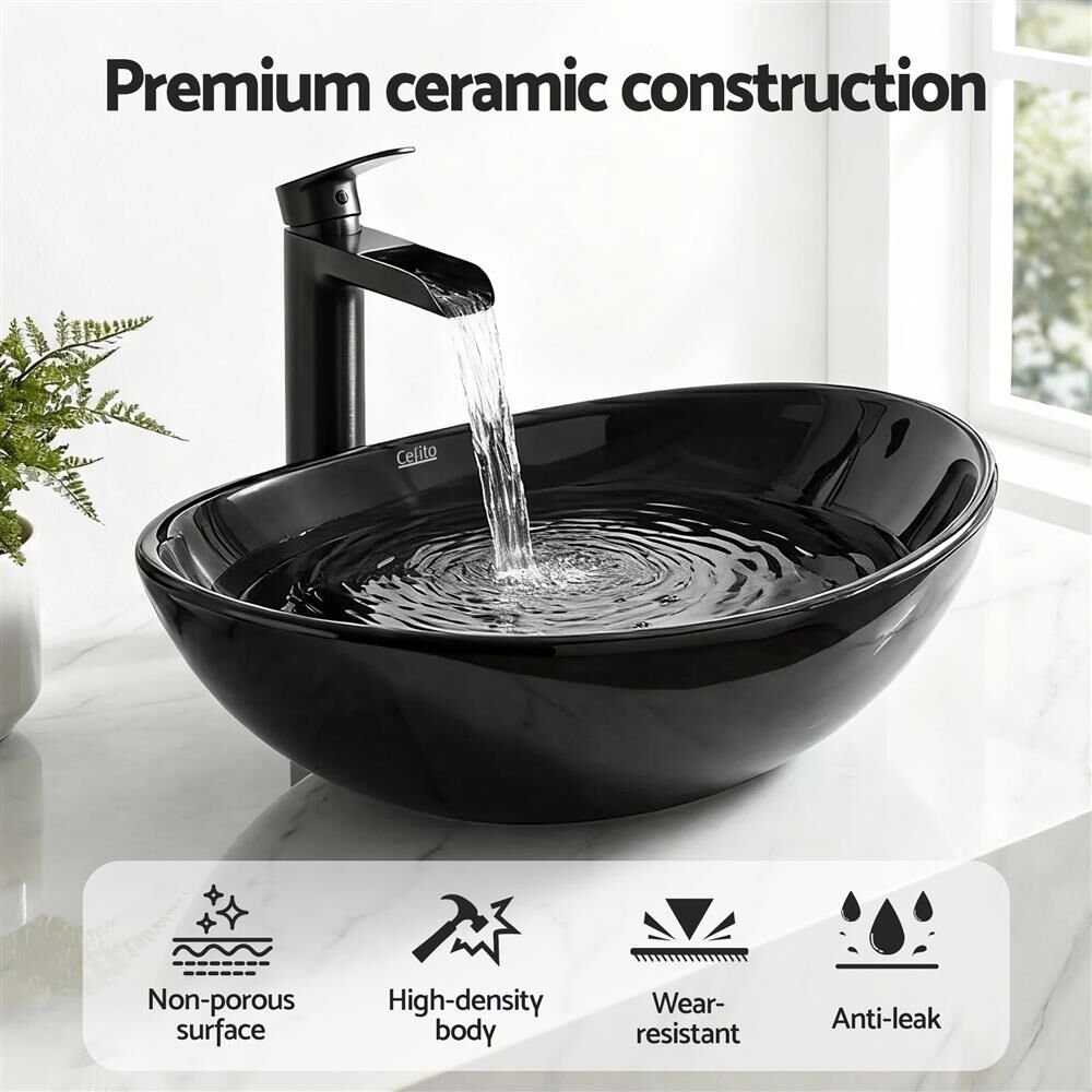 Add a touch of modern luxury to your bathroom with the Cefito Ceramic Basin. Featuring a stunning high-gloss black finish and an elegant oval vessel design, this 41cm countertop sink is a true statement piece. Built from durable, scratch-resistant crystalline ceramic, it offers lasting style and easy installation.