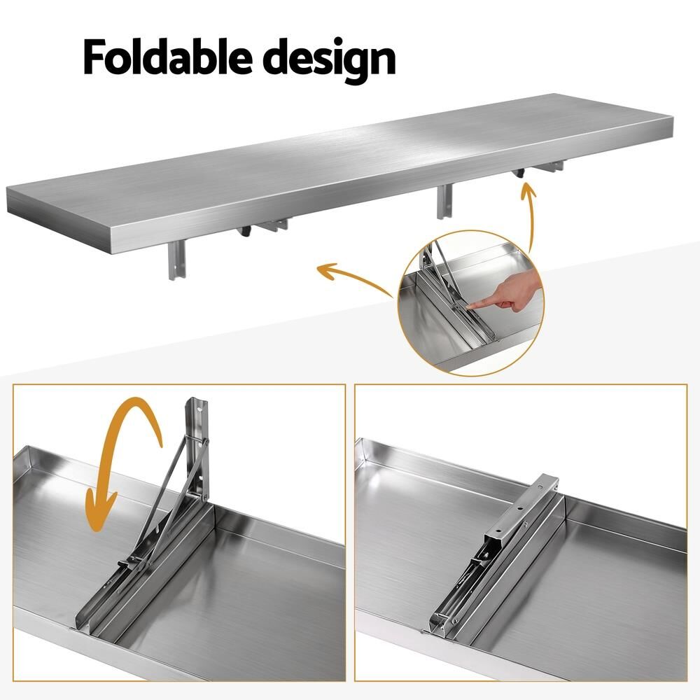 Declutter your space with the Cefito stainless steel wall shelf. Made from food-grade 201 stainless steel, it's perfect for both home and commercial kitchens. This foldable stainless steel shelf offers ample storage for all your supplies, with a robust 30kg load capacity. Its sleek design makes it a stylish addition to any area, whether it's for extra storage or as a metal floating shelf. The stainless steel floating shelf is easy to install and designed to save valuable floor space.