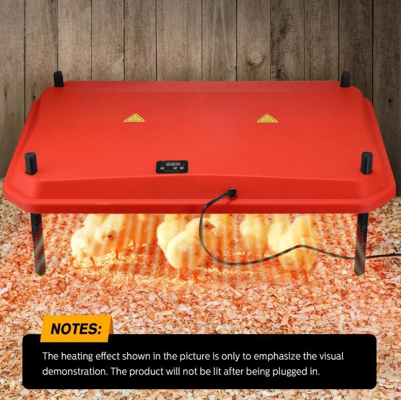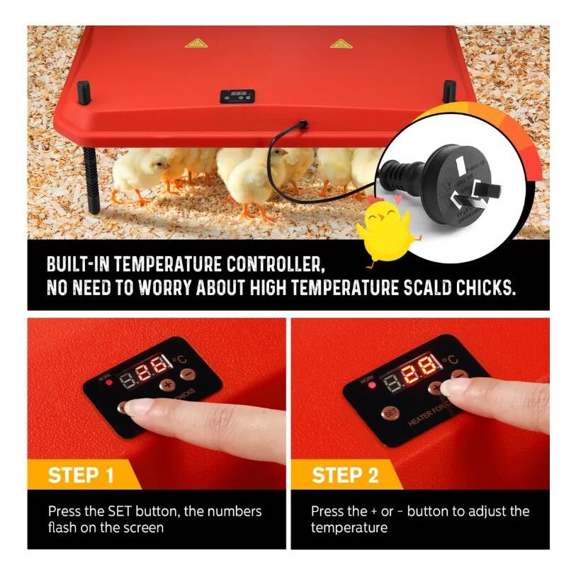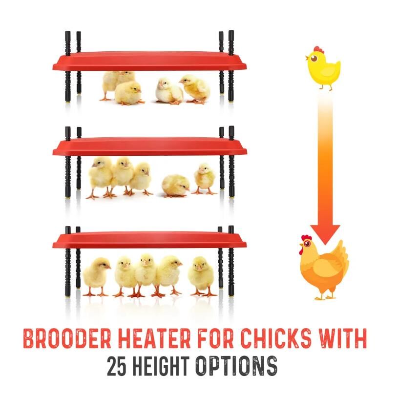 - NEW HEATING PLATE FOR CHICKS: 40x60CM Brooder Plate with Height Adjustment. It is simple to adjust and track the growth of your chicks. Multiple angle options mean every chick will find their favorite positions and keep around 40–50 chicks warm at the same time.
