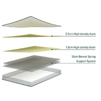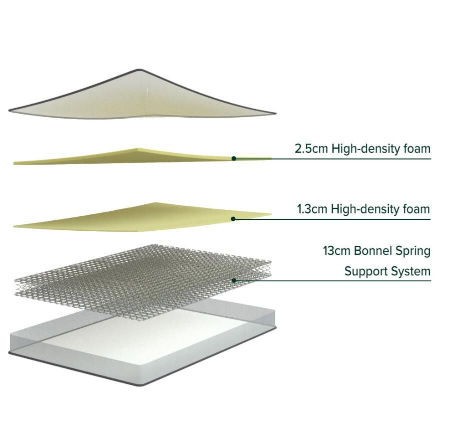 - Materials: 12.7cm bonnell spring; 2.54cm high density foam for top quilting; 1.3cm high density foam; felt cloth bottom; 100% knitted jacquard polyester fabric top