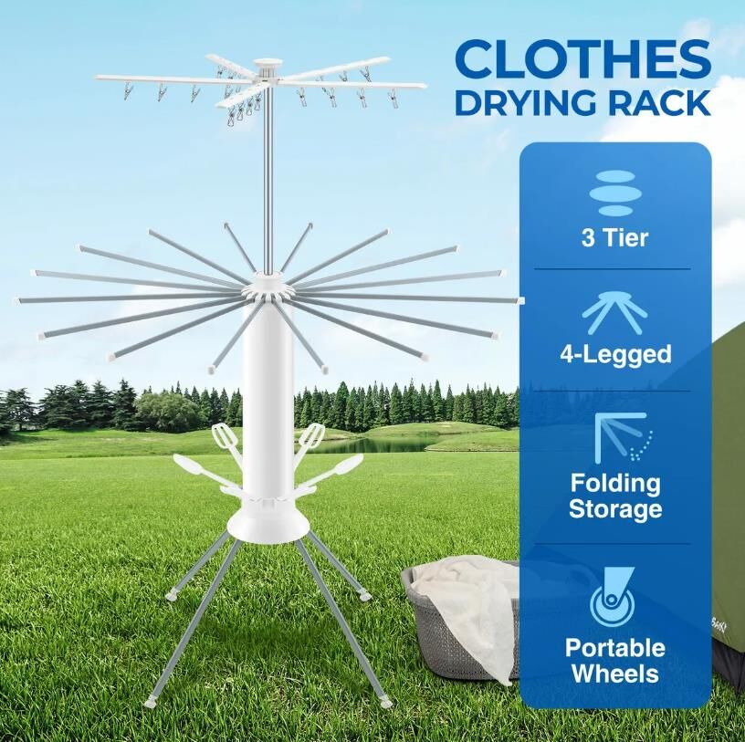 - Generous Capacity: Three-tier design offers ample drying space: top tier with clips for small items, middle tier for shirts and pants, and bottom tier for shoes.