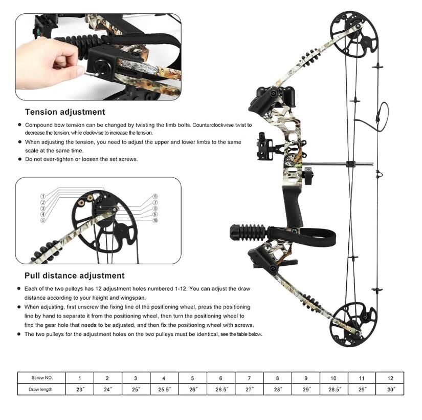 - High Quality: high-strength magnesium alloy bow limbs and an aluminium alloy bow handle. High-performance dual cam system. Adjust the draw weight and draw length with an enclosed Allen wrench. No bow press is needed. The application of a rubber damper and string silencer makes the shooting more stable and less noisy.