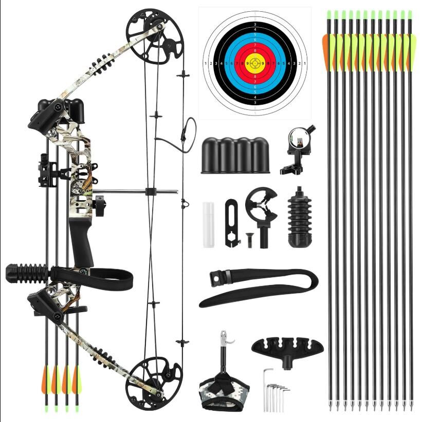 1 x Compound Bow 1 x Release Aid 12 x Composite Carbon Arrow 1 x 5-Pin Optical Bow Sight 1 x Brush Arrow Rest 1 x Rubber Stabilizer 1 x Rubber Damper 1 x Target 1 x Manual |