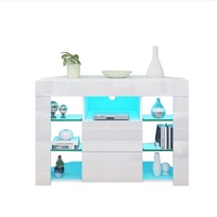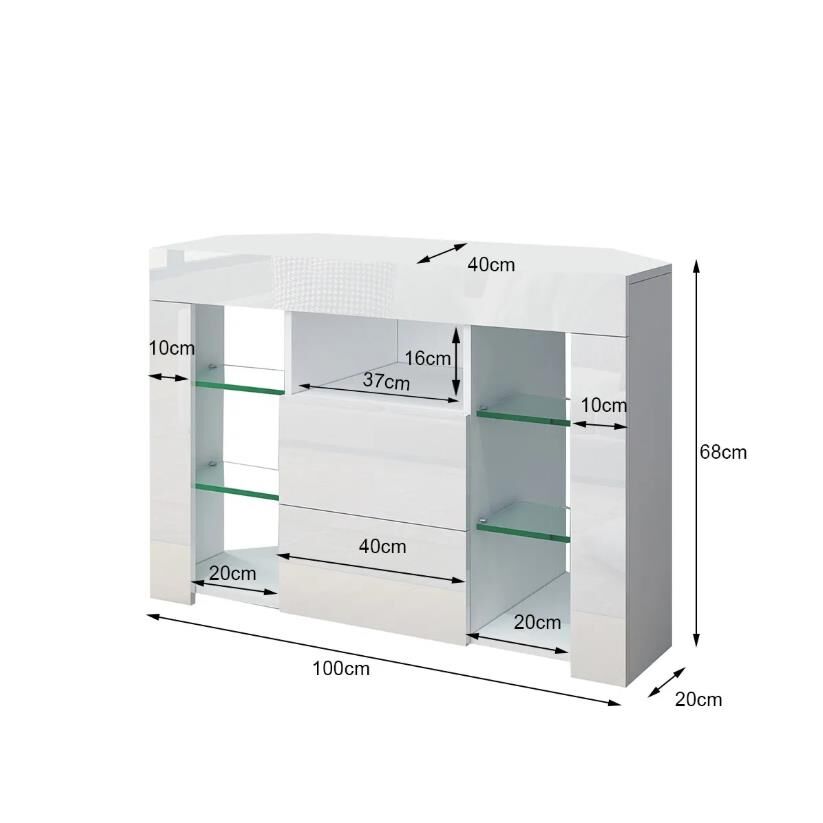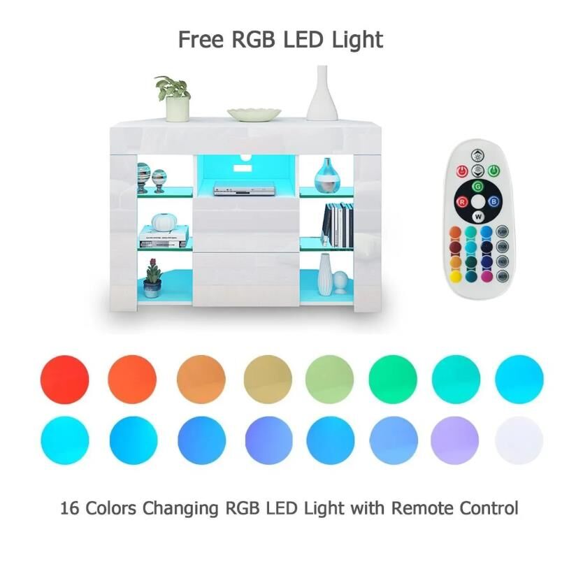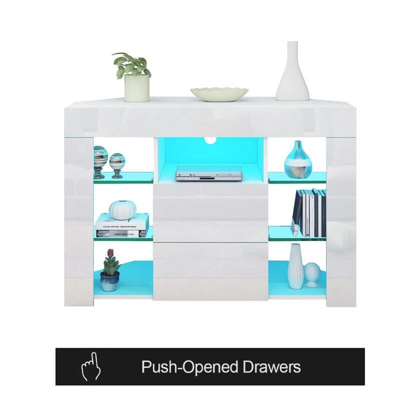 Crafted with high-quality particle board and UV paint front construction, this TV cabinet with two drawers will meet all of your entertaining and storage needs. The LED lighted television cabinet features LED light with 16 kinds of lighting colours and 4 auto transform modes, which adds fun to your living room. Moreover, the TV unit comes with a high gloss front, making the beautiful reflection on the surface. Two drawers and open shelving offer you ample storage space to hold a variety of items including books, snacks, remote control, toys, etc, making your space tidy and clean. In addition, assembly of this modern TV stand is a breeze. The existence of this led lighted TV unit will give your living room a completely new look.