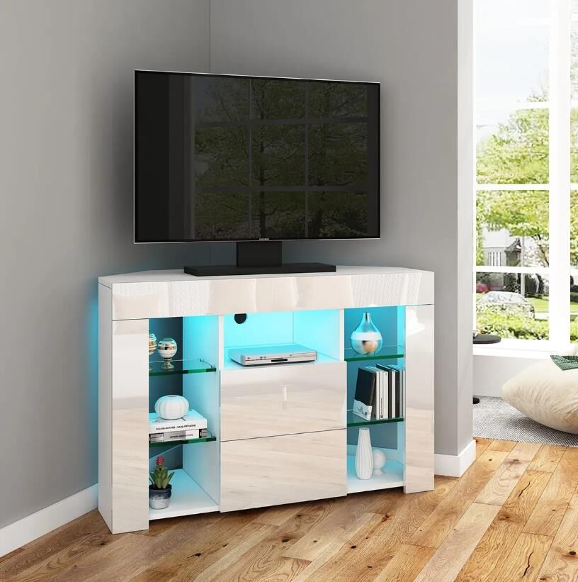 Corner TV Unit Stand Cabinet LED Lighted High Gloss 2 Drawers Furniture White