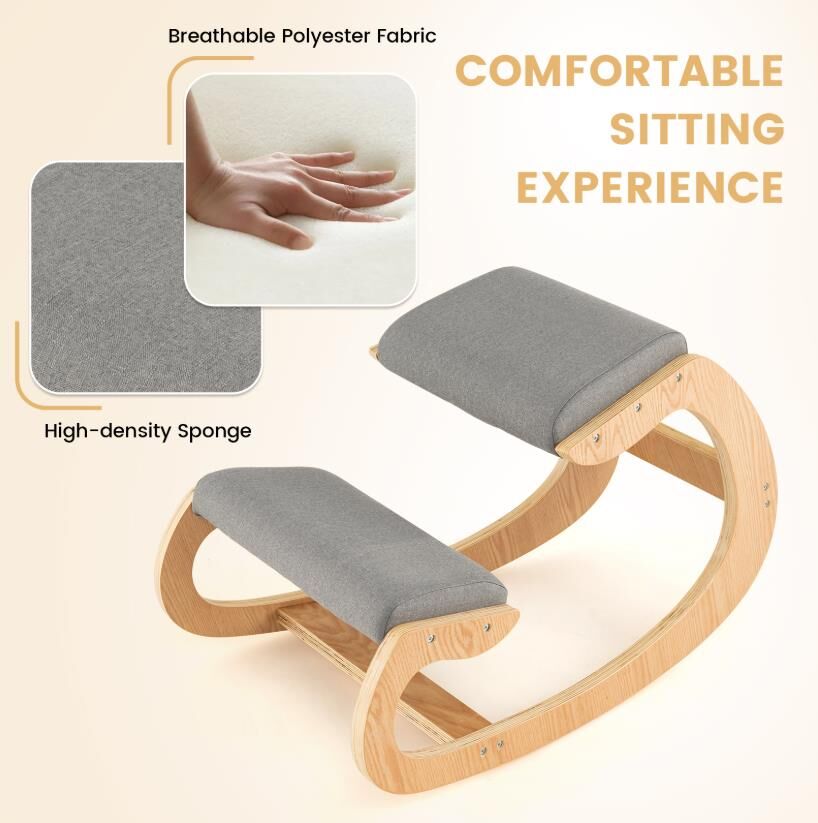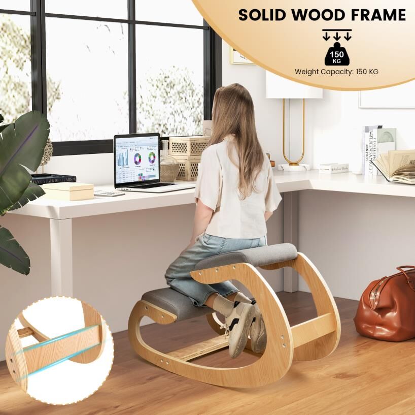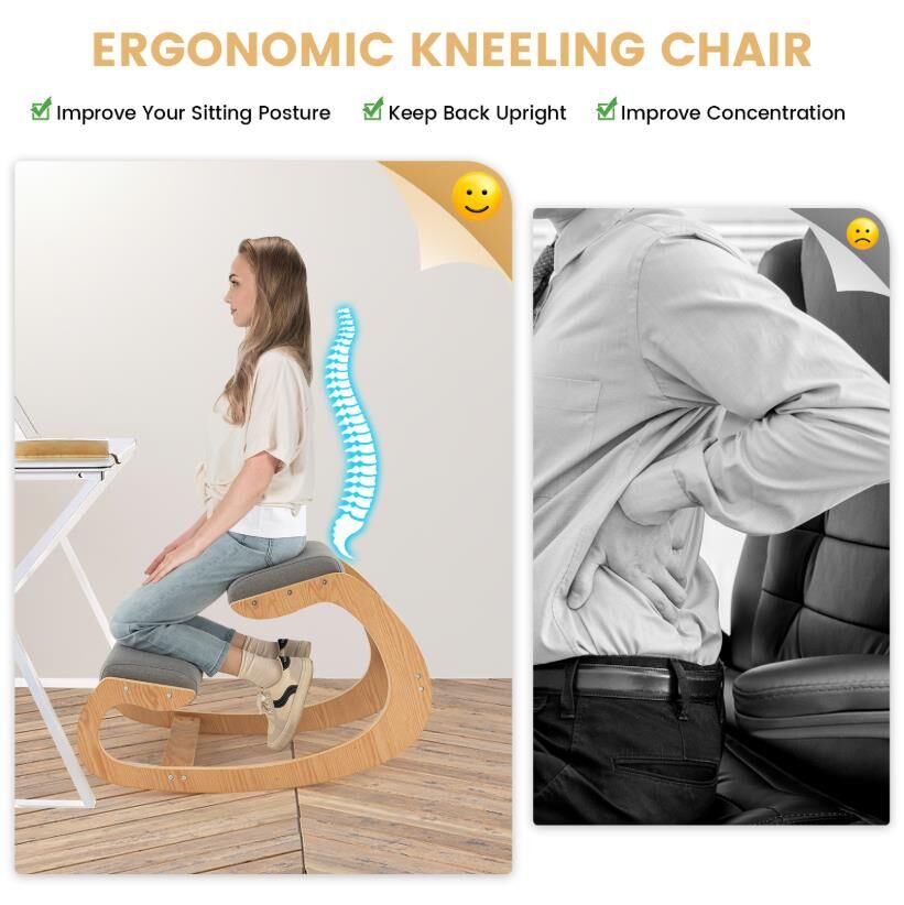 Experience comfort like never before with our innovative ergonomic kneeling chair! Say goodbye to pain and hello to an upright posture that will revolutionize the way you work. Our knee chair encourages a natural, upright posture by distributing the body's weight between the shins and buttocks. But that's not all! With rocking function, made possible by a curved base design, it actively tones your core muscles, and banishes fatigue. Made of solid wood, the sturdy rocking base can support a large weight. Indulge in the lap of luxury with thick, high-density sponge cushions that provide unparalleled comfort and breathability. Suitable for various activities, our chair is a versatile addition to any space. All hardware included and it is super easy to put together! Elevate your comfort and productivity with our ergonomic kneeling chair today!
