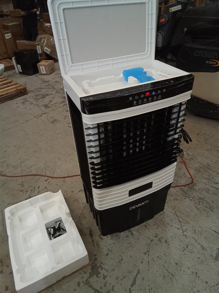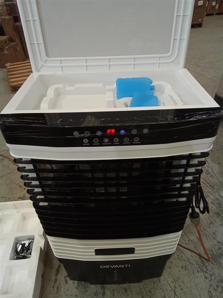 Discover cooling comfort with our Devanti evaporative air cooler. Enjoy 3-in-1 functionality (cooler, humidifier, purifier), LED display with remote, easy tap water filling, automatic swing, adjustable louvers, honeycomb cooling pad, ionizer, and energy-saving efficiency. Ideal for refreshing any space with ease.