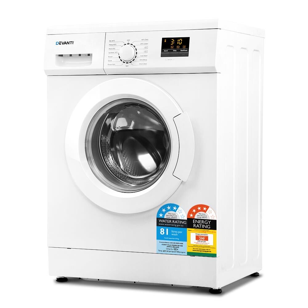 With up to 8kg of washing capacity, our Devanti Front Load Washing Machine certainly makes light work of your washing. Choose from 15 programs to suit your requirements, including useful 18-minute quick wash and anti-allergy modes. To save on energy bills, you can also delay start up to 24 hours to do your washing during off-peak hours. Other great features include hot water washing of up to 90°C water temperature, LED display screen and a very efficient and effective spin speed of 1400rpm. The large opening facilitates easy loading and unloading, and a child-lock feature also ensures that the front door and control panel will be locked from accidental tampering by any child. Not least, the washing machine has energy and water ratings of 4 stars and is SAA-approved for Australian usage.