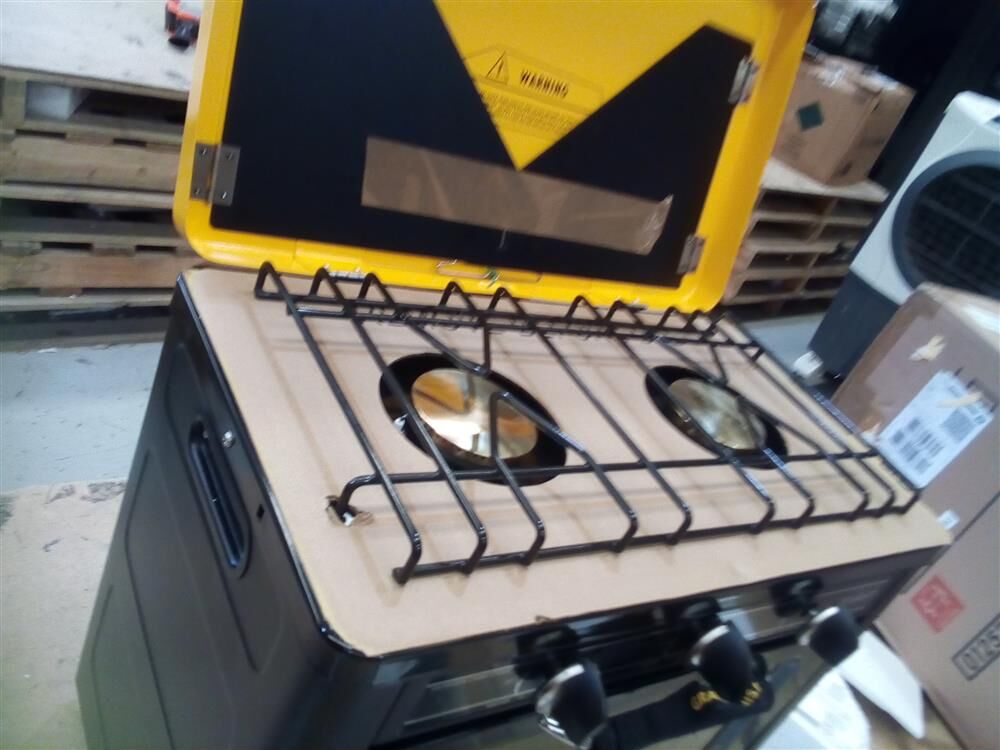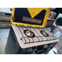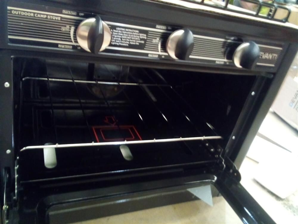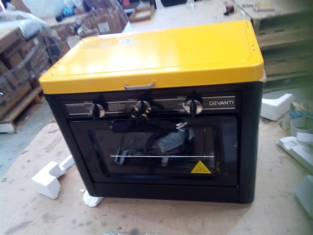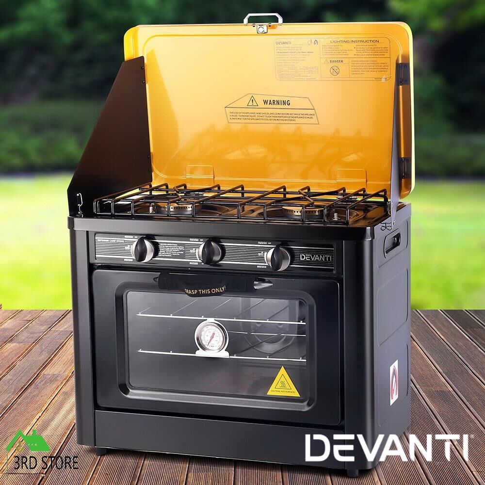 Features Stainless steel construction 2 x 5,300 BTU powerful stove burners 3,500 BTU oven with two removable racks Insulated cloth sleeve design - Exclusive only from Devanti See-through tempered glass window Push-in piezo burner ignition Flame-out protection Fully adjustable heat-control dials Built-in oven heat gauge Non-stick enamel cooking surface Insulated oven box Folding lid provides a three-sided windscreen Convenient carry handles Removable thermometer included Hose and regulator included Easy connection to LPG bottle (AGA approved)