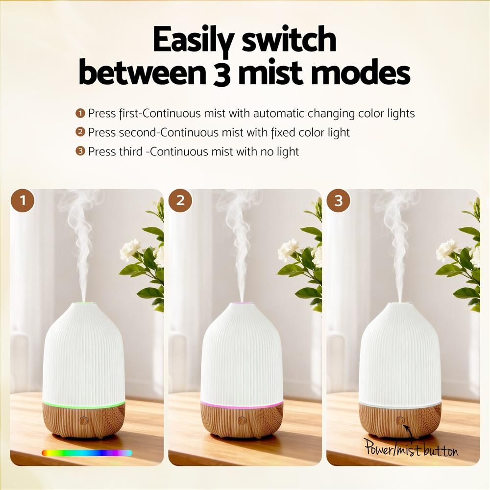 Elevate your space with this sleek vertical diffuser, designed to fit effortlessly into any modern room. Using ultrasonic technology, it releases a fine mist to enhance air moisture and carry your favourite essential oils. The 100ml capacity and 40呢 coverage make it ideal for bedrooms, offices and living areas. Choose from three mist button functions, two lighting settings and a soothing 7-colour LED glow to create the perfect ambience. Whisper-quiet operation ensures peaceful use day or night, while the waterless auto-off function provides safe, worry-free performance. Compact, energy-efficient and stylish, it brings comfort and relaxation to any indoor environment.