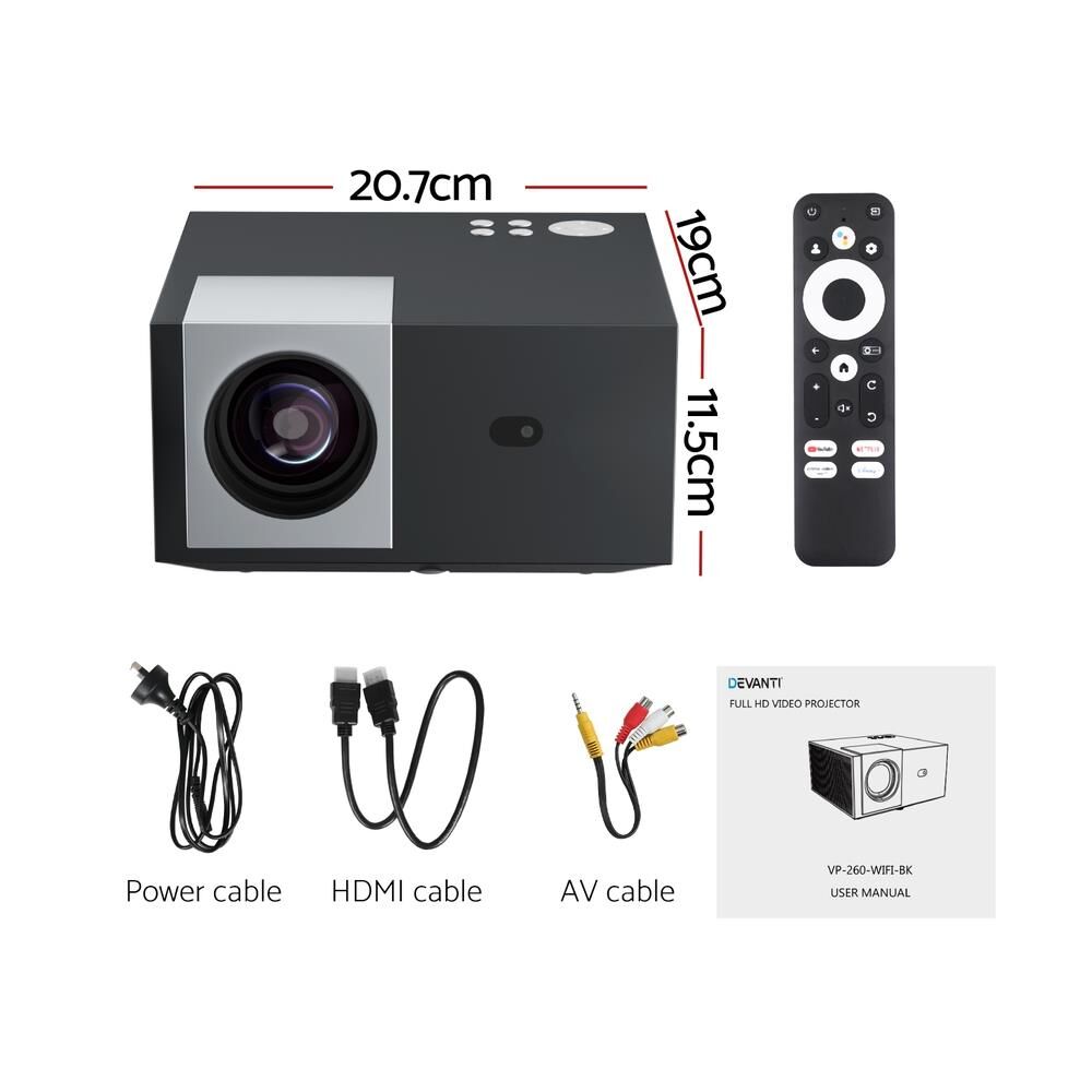 From the small screen to the big screen, now you can enjoy epic entertainment with our Devanti Video Projector. With its ultra-expansive colour gamut, the projector delivers crisp clear images with more brilliant colours to give you the best projection experience. The projector is fully 1080p compatible, so you won't have to compromise on quality. Using Wi-Fi connectivity, our video projector supports screencasting from your Phone, Pad, smartphone, tablet or laptop, so you can stream your favourite content effortlessly. It also features a built-in heavy bass speaker and a high-lumens lamp. For even more entertainment value, the projector includes HDMI, USB, AV and audio ports for fast connection to multiple devices such as external speakers, game consoles and hard disks. Comes with a remote control so you can power your entertainment straight from the couch. Get the home cinema experience and order yours today!