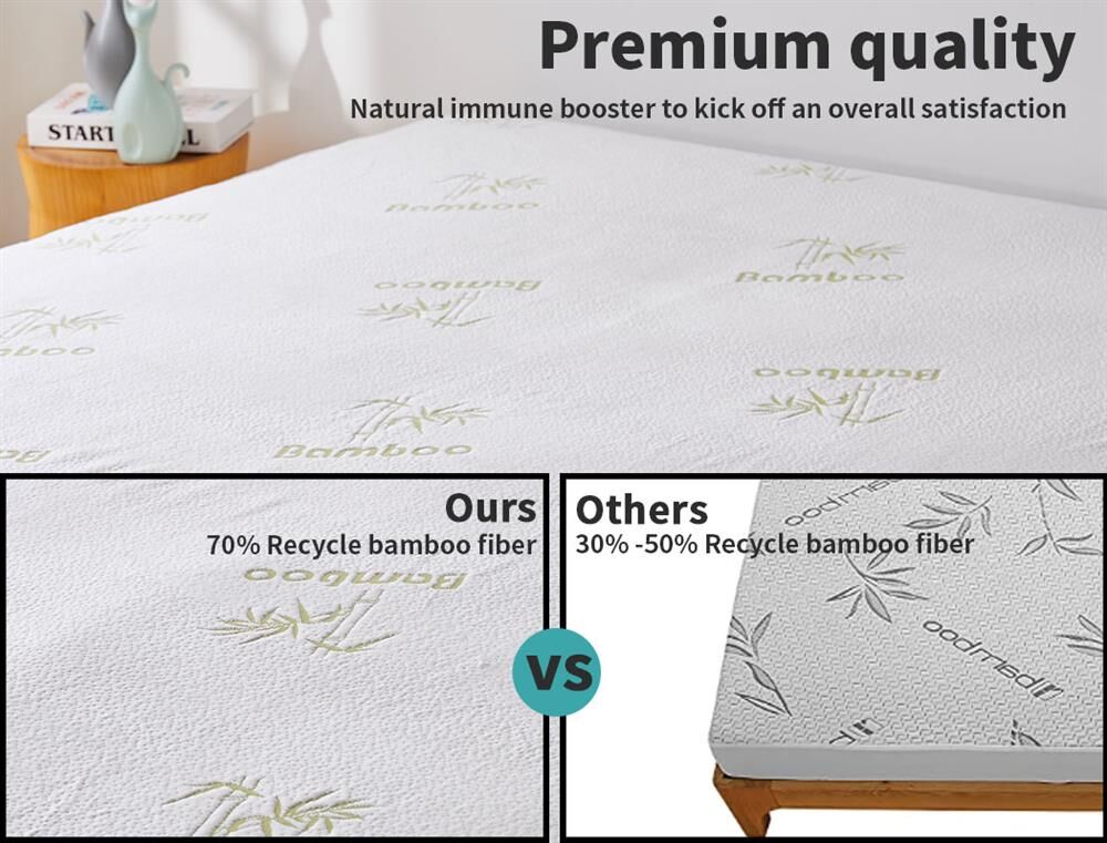 Designed with your comfort in mind, our new version mattress protector features an anti-fungal, antibacterial, hypoallergenic and antimicrobial properties of the natural bamboo fibre containing 70% recycle bamboo fiber which adds 25 to 45 percent more than others. It helps regulate temperature and wicks away moisture, creating a comfortable sleep environment and allows fresh air to flow while act as a barrier against liquid or dust mites penetrating into your mattress. High bamboo component acting as a soft and breathable agent adds the sweet to your dreams. This mattress protector features impermeable 100% waterproof TPU back coating that provides protection on top of the mattress. It ensures that you won't hear a plastic noise when you move during the night, while the soft top provides you with unparalleled comfort.