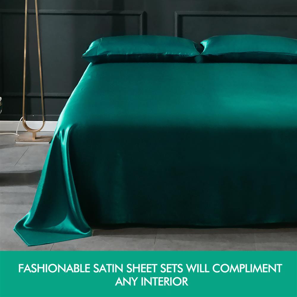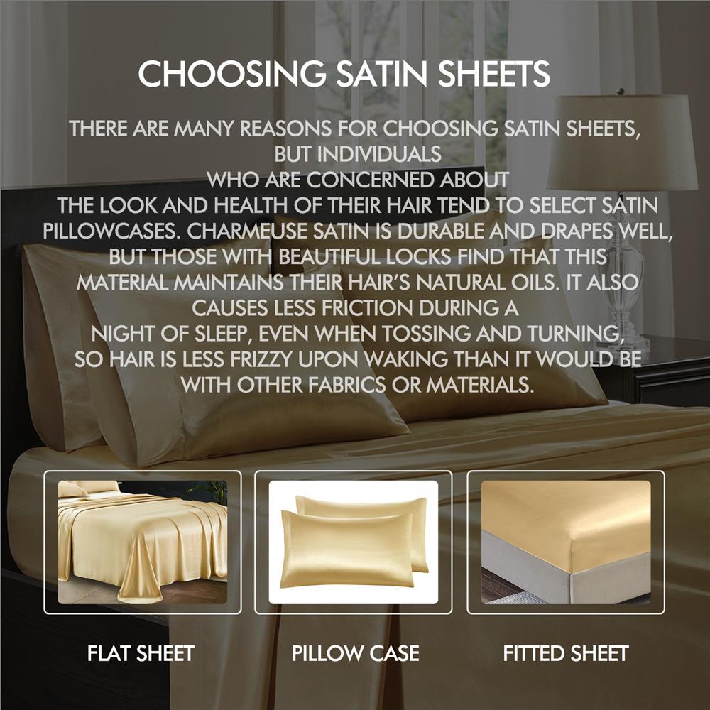 Dreamz Bed Sheet Set features a beautiful sheen that perfect fit for any interior. Shiny, silky-like cover have a sublimely smooth touch. Made from pure woven polyester satin, it gives into a luxurious night’s sleep. Soft and smooth texture prevents hair from frizzing, breakage, and split ends during sleep. Satin pillowcases prevent sleep lines appear on face yet do not retain any moisture which allow your skin care products remain fresh on your face. Free yourself from old time bedding style for new ultimate elegance and comfort. No wrinkles or creases. Easy to care for in the washing machine and dryer. Bed Sheet Set comes with fitted sheet, flat sheet and standard pillowcases. A huge range of luxurious and sensual colors available.