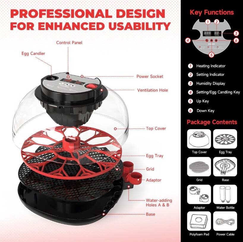- Clear Monitoring & Easy Cleaning: With 360° visibility and a built-in egg candler, you can easily monitor embryo development throughout the 21-day cycle. The incubator also has detachable trays and wipeable surfaces, making cleaning simple (hand wash only).