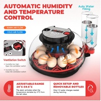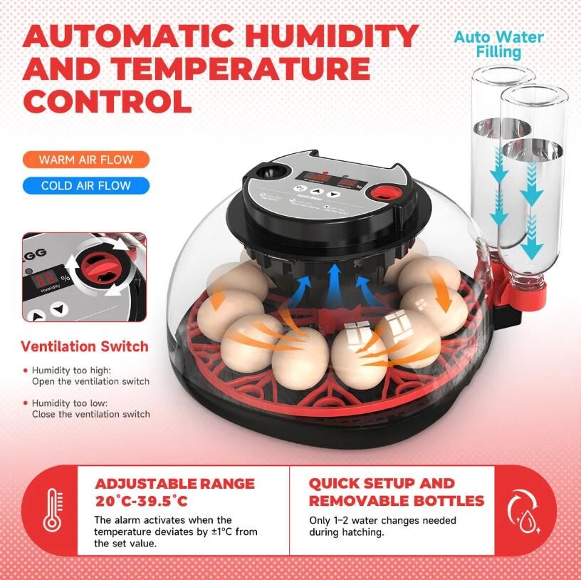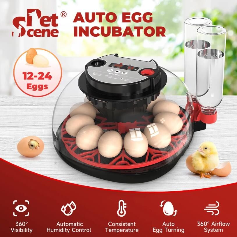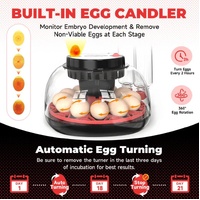 Improve your hatching success and raise healthy chicks with this Automatic Digital Egg Incubator Hatcher for 12-24 Eggs, ideal for chickens, ducks, quails, parrots, and other bird species. Featuring a patented 360° airflow system, it delivers high hatch rates, fitting 12 larger or 24 smaller ones. Moreover, the advanced humidity control system with two auto-refill water bottles and adjustable air vents offers stable and precise conditions, all monitored via a digital display and clear viewing lid. Besides, this chicken egg incubator turns eggs every two hours for consistent heating and optimal embryo development, supported by an integrated fan for even heat distribution. Even better, you can track embryo progress with a built-in egg candler and enjoy easy maintenance with detachable trays and wipeable surfaces. Versatile and practical, this automatic egg incubator is perfect for farms, homes, labs, and educational settings, fully catering to your hatching needs.