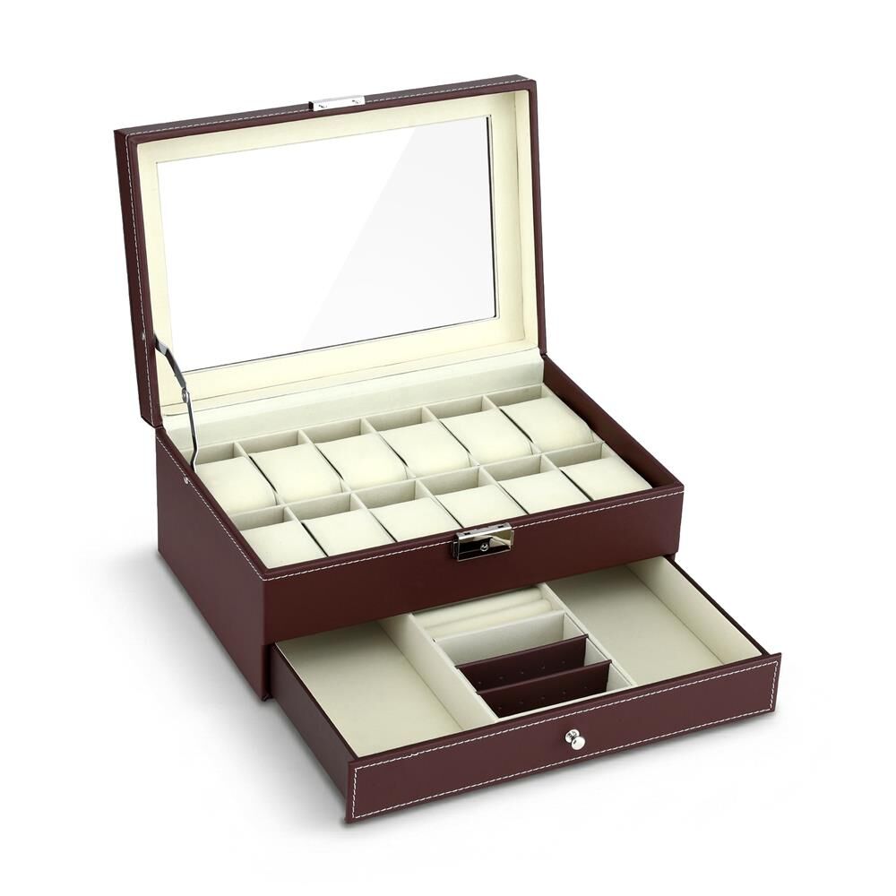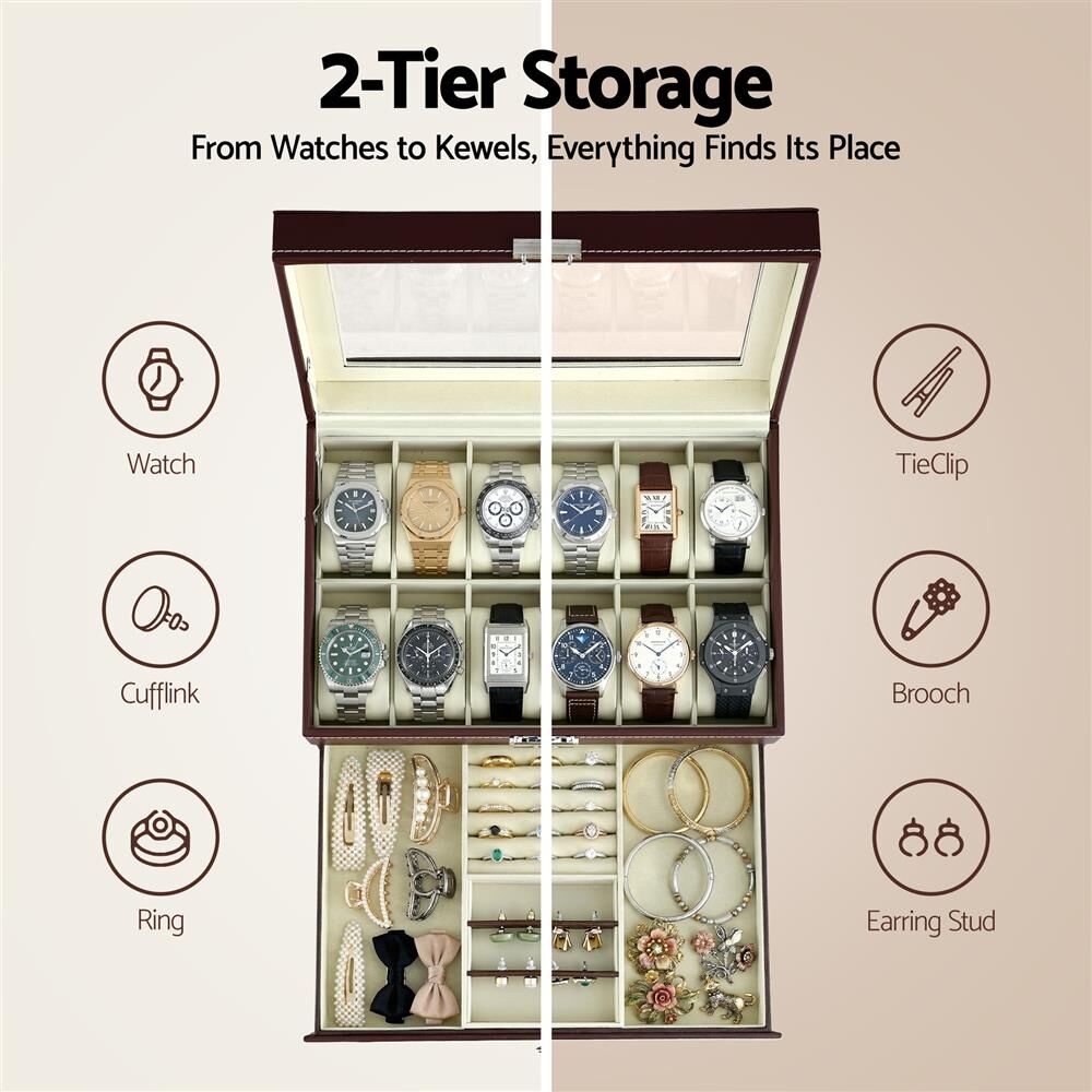Keep your watch and jewellery collection organised and on display with this elegant two-tier storage box. The top tier securely holds your watches with soft, individual cushions, while the bottom pull-out drawer neatly stores rings, earrings, cufflinks, and more. The clear glass-view lid lets you admire your items at a glance. Crafted from premium materials, it's a stylish and practical addition to your dresser or wardrobe.