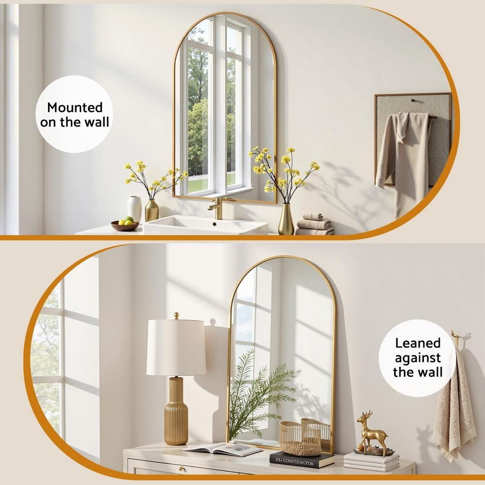 Elevate your space with the Embellir Arch Wall Mirror. This decorative piece features an elegant arched design with a slim, gold metal frame, adding modern sophistication to any room. Its high-definition glass offers a crystal-clear reflection. Perfect as a bathroom vanity mirror or as wall art.
