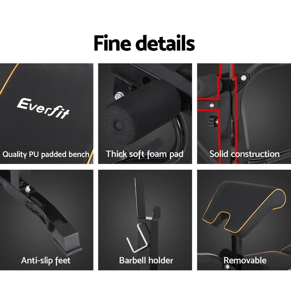 Get the full workout in one place with the Everfit Multi-functional Weight Bench. Designed for a full-body workout, you can build your core, arms, abdomen and legs all from one machine. The set is suitable for leg extensions, incline presses, preacher curls, chest flys and so much more. It has a 330kg weight limit and a tough, sturdy steel powder-coated frame for long-lasting use. The thick PU padding and foam protection for your knees will keep you safe as well as comfortable. Designed with adjustable height and incline levels, you can always work out at your most comfortable and effective level. A removable preacher curl bench and flexible foam rollers allow you to work in total customized comfort. The set is suitable for both standard and Olympic dumbbells. The bench is easy to assemble thanks to its simple and foldable design, and you can install and store this weight bench anywhere in your home using the included instructions. So, what are you waiting for? Buy an Everfit Weight Bench today and achieve your greatest gains today.
