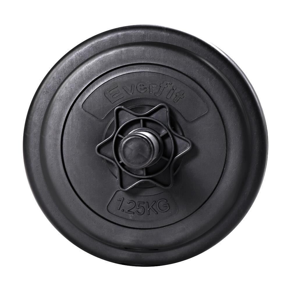 Time to get tough. And our Everfit 17kg Dumbbell Set is the right deal if you are looking to boost those triceps, biceps and shoulders. Or lose some unwelcome fat. Whatever is your game, our dumbbell set lets you strengthen and tone those muscles in pleasing style. The commercial-grade dumbbell features a high-quality bar with non-slip handle that offers optimal gripping surface. Weight plates consist of 1.25kg and 2.5kg pieces, and are made of cast cement coated with smooth plastic, reducing clanging sounds and making them more floor-friendly. You can adjust the weight of the dumbbell by removing the weight plate and only using the dumbbell bar (weighing 1kg each) or adding more compatible weight plates. And the high-quality steel star-shaped nuts ensure the weight plates stay securely in place for safe workouts. Best of all, the dumbbell comes in a set of two (two 8.5kg dumbbells for 17kg total) so that you can exercise both arms at the same time. Gym junky or workout pro, you can get fit easily with our dumbbell set.