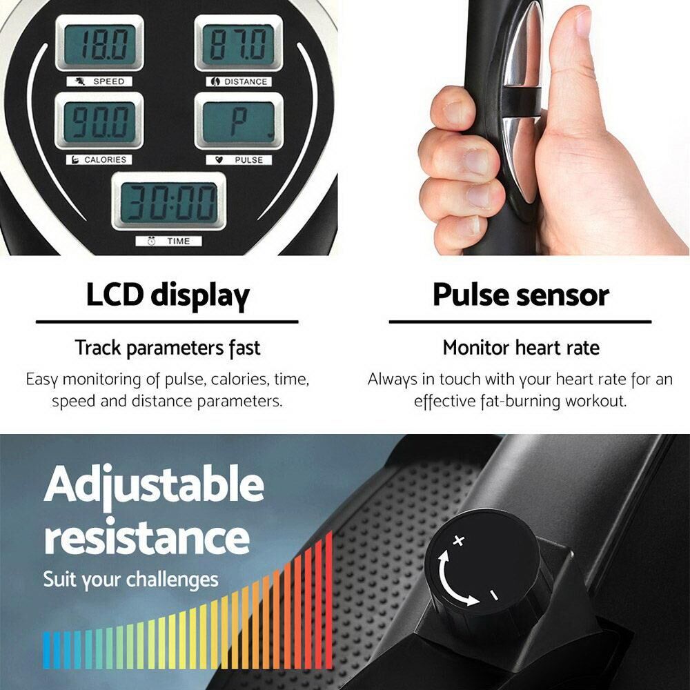 Elliptical cross trainers are excellent fitness machines for individuals who demand a training regime that works on all muscles and yet eliminates the risk of impact injuries such as treadmill running or walking. Hence the trainers are particularly helpful for those with joint problems with knees and feet. Our Everfit Elliptical Bike is a very efficient low-impact cross trainer that offers adjustable mechanical resistance to tone every muscle in your body. The easy-to-read LCD display lets you keep track of your training parameters. The industrial-strength powder-coated steel frame is strong and sturdy and the large seat is comfortable with every stride. Other great features include built-in pulse sensors, rubber-clad pole grips, reversible two-way movement, mode changes within 30 seconds and adjustable handlebar height and seat. Not least, the elliptical bike allows you to exercise whenever you want, anytime and anywhere.