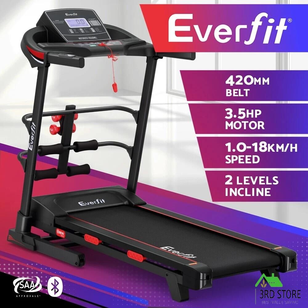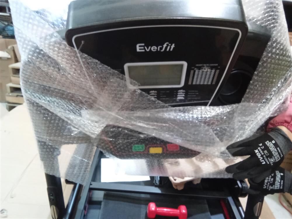 Introducing our premium Everfit treadmill with a robust composite running board and strong powder-coated steel frame. Featuring a user-friendly control panel, clear digital LCD display, high-performance motor, and durable running belt. Enjoy automatic incline, shock absorption, heart rate monitoring, and Bluetooth connectivity.