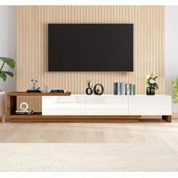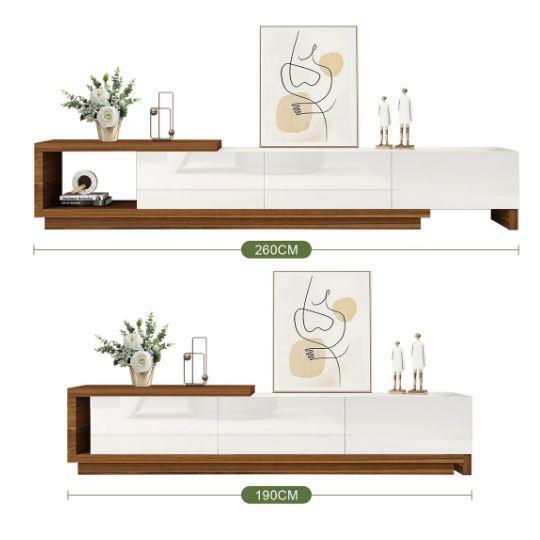 Our sleek, modern TV stand is a versatile addition to elevate your living room. Its flexible dimensions, extendable from 190cm to 260cm, ensure a perfect fit for any space. Featuring three spacious drawers and an optional open shelf, it offers ample storage for media essentials and decor. High gloss drawer fronts add contemporary charm and a reflection effect. Maintenance is easy with its wipe-clean surface. Furthermore, the sturdy 4cm thick frame guarantees durability, and its reversible design allows for versatile placement. With chic colour blocking and thoughtful features like rebound devices on drawers, our Walnut TV Stand seamlessly combines style and functionality. Upgrade your entertainment area with this modern masterpiece for a haven of contemporary elegance.
