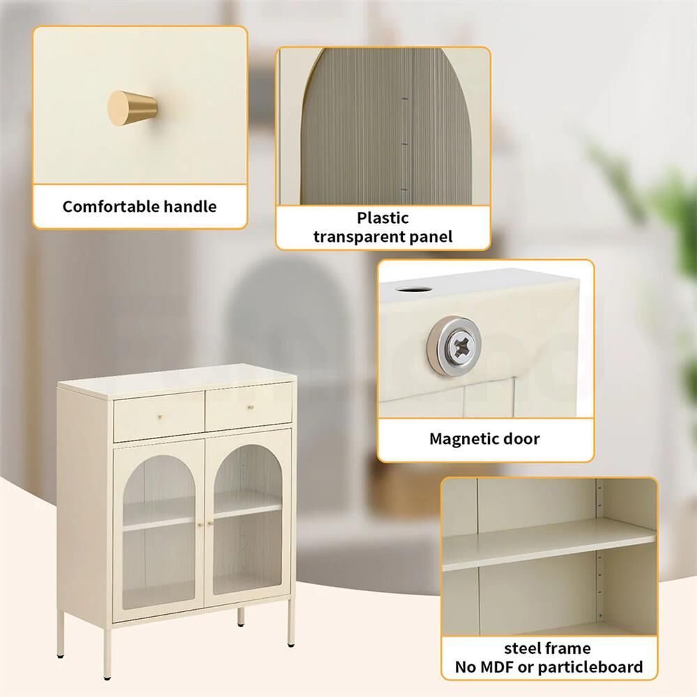 --【Premium Quality Materials】Crafted from cold-rolled steel and transparent panels, this sideboard is both durable and stable. Its sturdy construction ensures exceptional strength, while the materials resist rust, erosion, and wear. The transparent panels offer excellent light transmission, enhancing the storage cabinet's modern appeal and making it a sophisticated addition to high-end home decor.