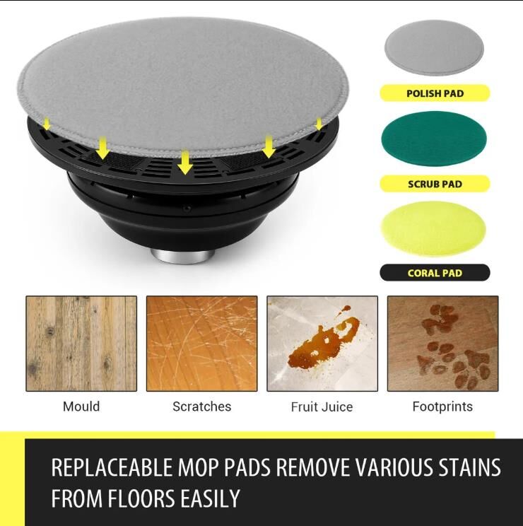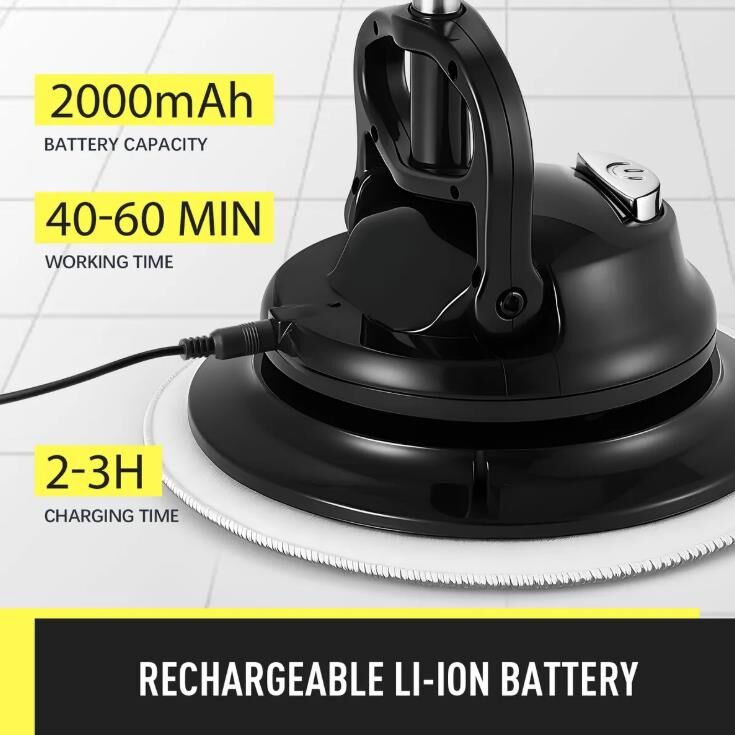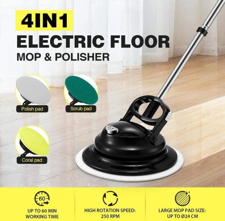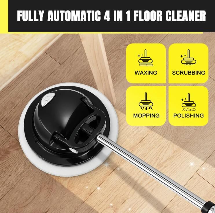 Deep clean and restore shine to your floors with this 4-in-1 Floor Spin Mop Cordless Electric Cleaner Scrubber Polisher Waxing Machine. Combining mopping, waxing, scrubbing, and polishing in one smart device, this electric mop is built to handle tough dirt, stains, and grime with ease. Featuring a powerful 12W motor, high-speed rotation, and a flexible 90-degree swivel head, this floor cleaner effortlessly reaches into corners and tight spaces for a thorough clean. Powered by a 2000 mAh rechargeable battery, our spinning mop delivers 40–60 minutes of continuous cleaning after just 2–3 hours of charging. The cordless design eliminates the hassle of tangled wires and constant plug changes, giving you greater freedom and mobility during use. Ideal for a wide variety of surfaces, such as tile, hardwood, marble, stone, and laminate, this all-in-one floor mop is perfect for deep cleaning every room in your home.