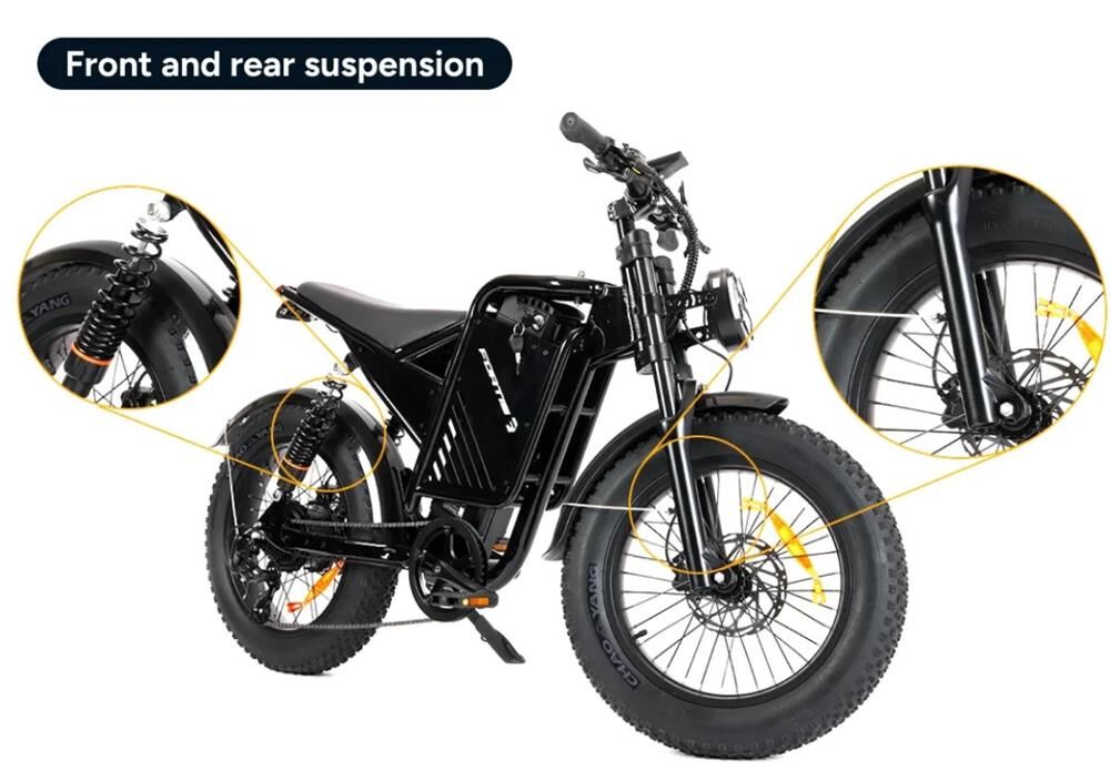 The fat 20” x 4” tyres paired with front and rear suspension soak up shocks, bumps and uneven ground. Whether you’re on the road, gravel or dirt, the FatBro Plus keeps your ride stable, cushioned and enjoyable.