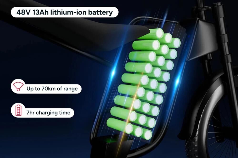 - 48V 13Ah lithium battery. Up to 70km of riding on a single charge.