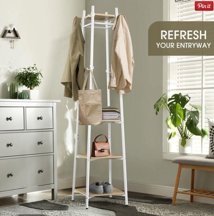 For those who want an organized entryway and easy access for you and your visitors, this Freestanding Coat Rack Clothes Garment Stand Closet Organizer Hooks Hanger Display Shelf is indispensable. You can place and hang all your accessories on the shelves and hooks of the coat stand that is crafted with a strong metal frame and top-quality wood boards. Solid and durable, the stylish display stand can hold a large weight capacity with 20kg of each layer and 5kg per hook. The adjustable feet with anti-slip pads ensure its further stability and firmness even on slightly uneven ground. Having an elegant and contemporary look in classic white, the closet organizer is perfect for any home.