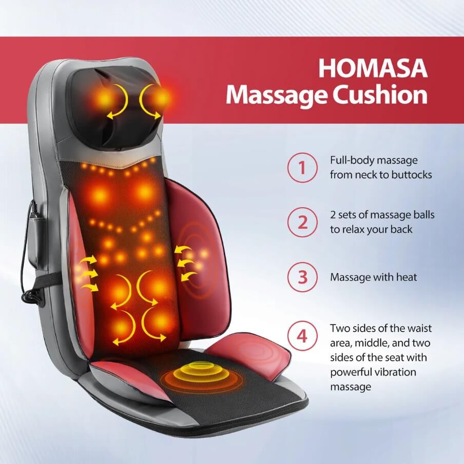 1 x HOMASA Massage Cushion 1 x Massage Pillow 1 x Foot Massager 1 x Adapter 1 x Car Adapter 1 x User Manual |