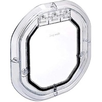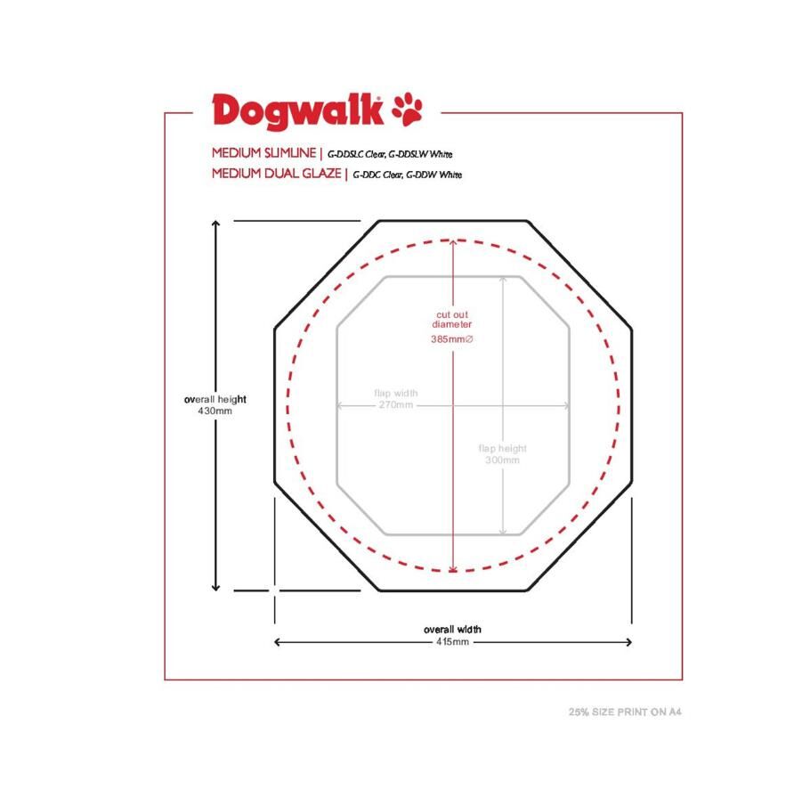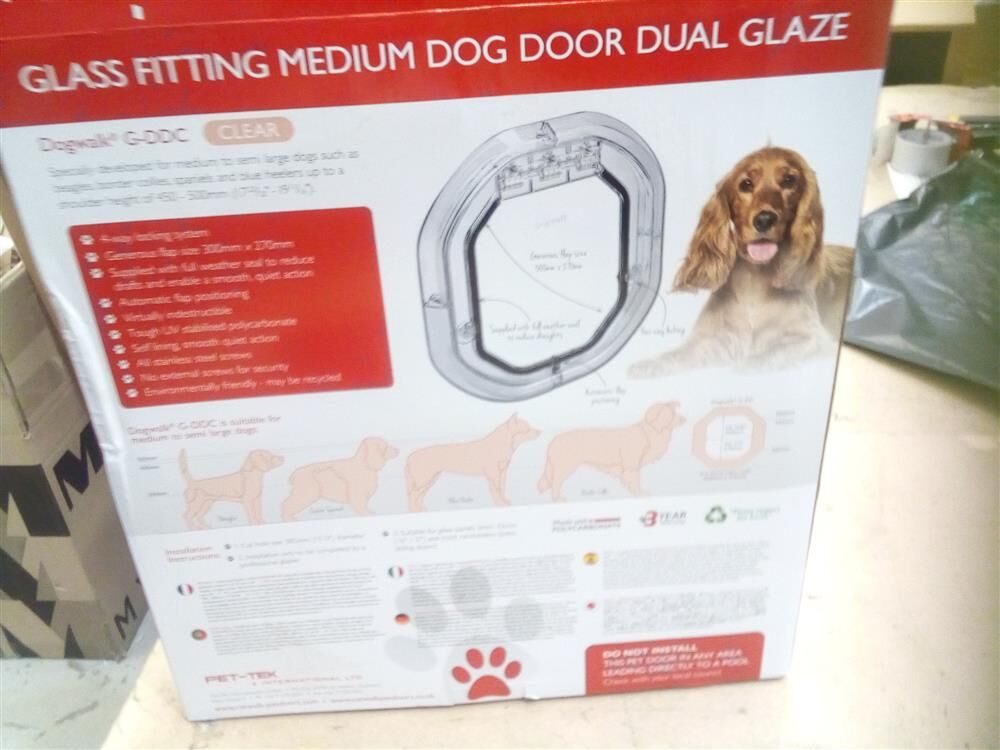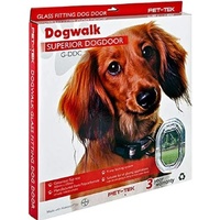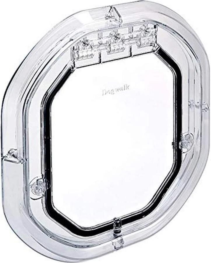 The Dogwalk glass fitting dog door is manufactured from 100% high impact polycarbonate. It is designed to fit single and double glazing. It has the added feature of the flap being able to swing higher to reduce the problem of broken flaps. This reduces the stress on both the flap and hinge. This dog door is suitable for medium sized dogs. It has a four way locking system and additional security clips.