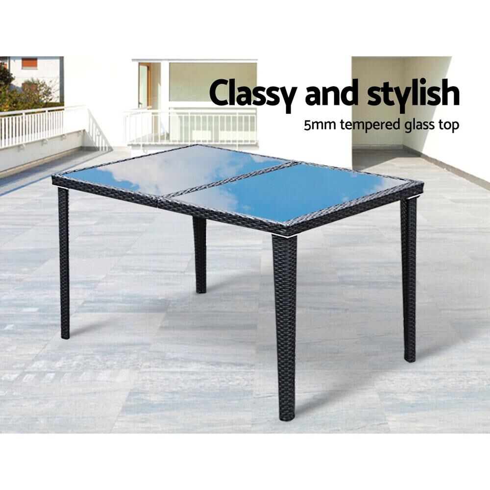 Dine in exquisite style with our elegant Gardeon Outdoor Dining Set. Finished in UV-resistant PE rattan with a strong and sturdy aluminium frame construction for both chairs and table, this multi-piece dining set is designed to please as well as stand up to the weather elements. The chairs have a sleek and contoured profile with 5cm thick high density foam cushions to ensure comfort and style are always in place. And the spacious dining table features a 5mm thick tempered glass top for safe and hardy use. Not least, a water-resistant cover for the entire ensemble is also included to keep it clean always.