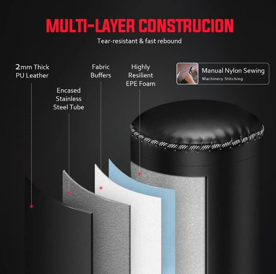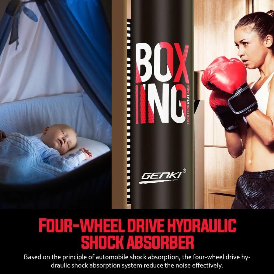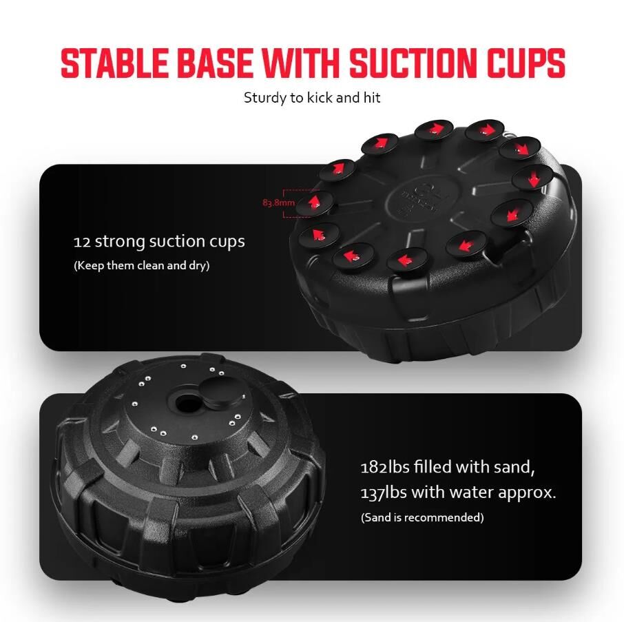 No matter you are a professional boxer or personal trainer, you'll surely love this free-standing punching bag. It features a sturdy and durable frame, along with strong and soft PU leather and fine stitching, as well as strong suction cups, ensuring its stability. The superior hydraulic shock absorption technology contributes to a quiet and safe punching result. This punch bag is suitable for all training projects, like boxing, MMA, UFC, taekwondo, Muay Thai and more. Not only can this boxing bag help you stay in shape through continuous training, but also improve your muscular strength and endurance. Pick up this heavy bag now and get ready for your training sessions.