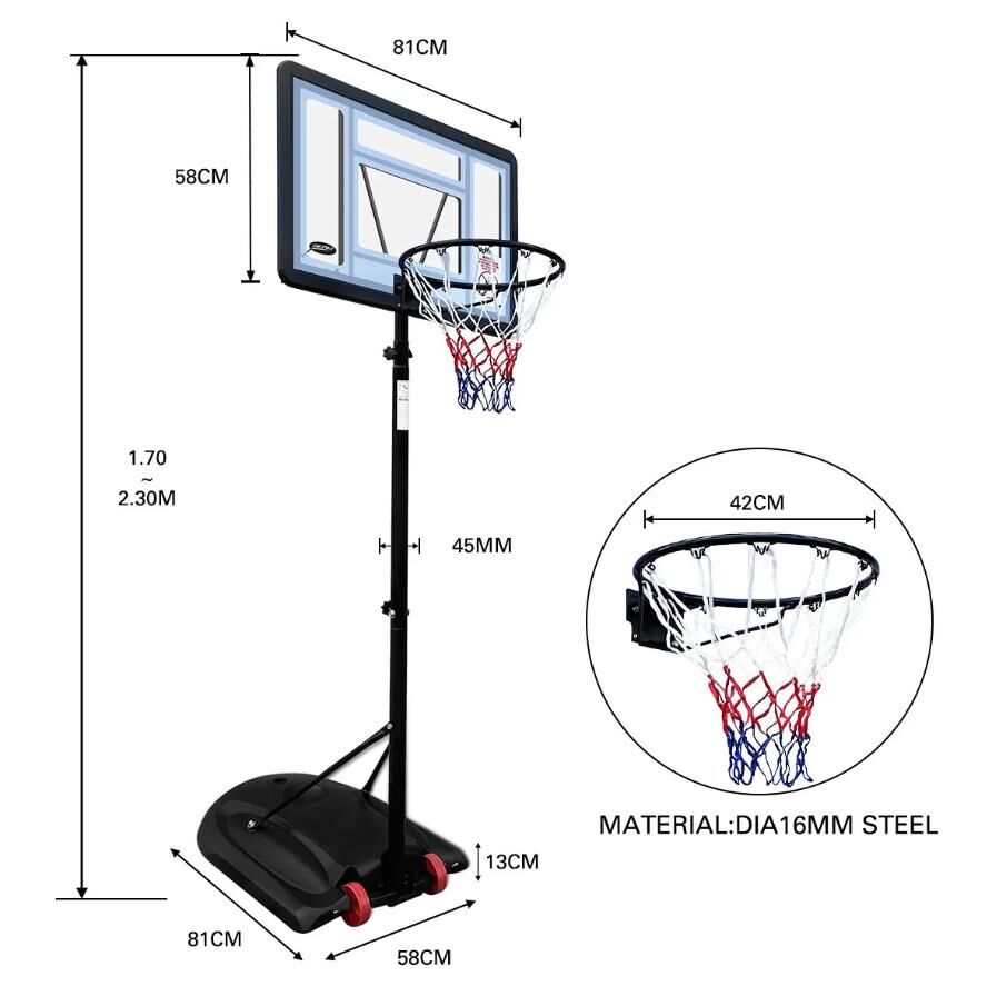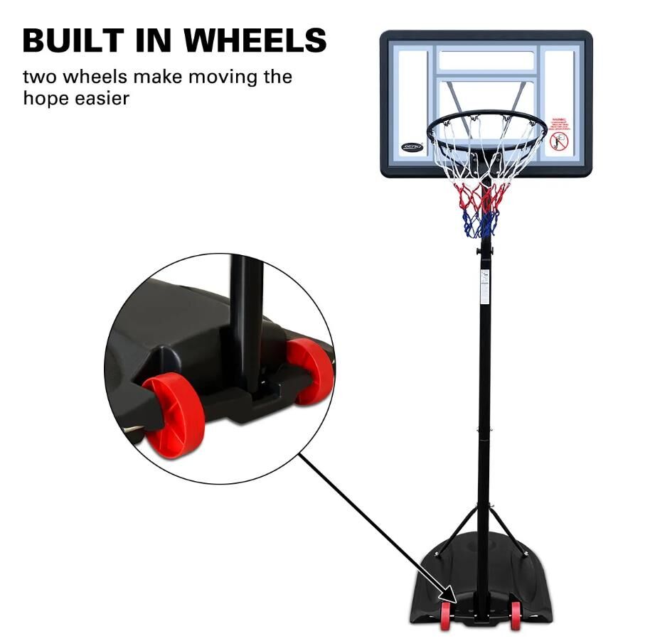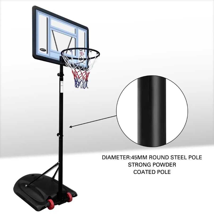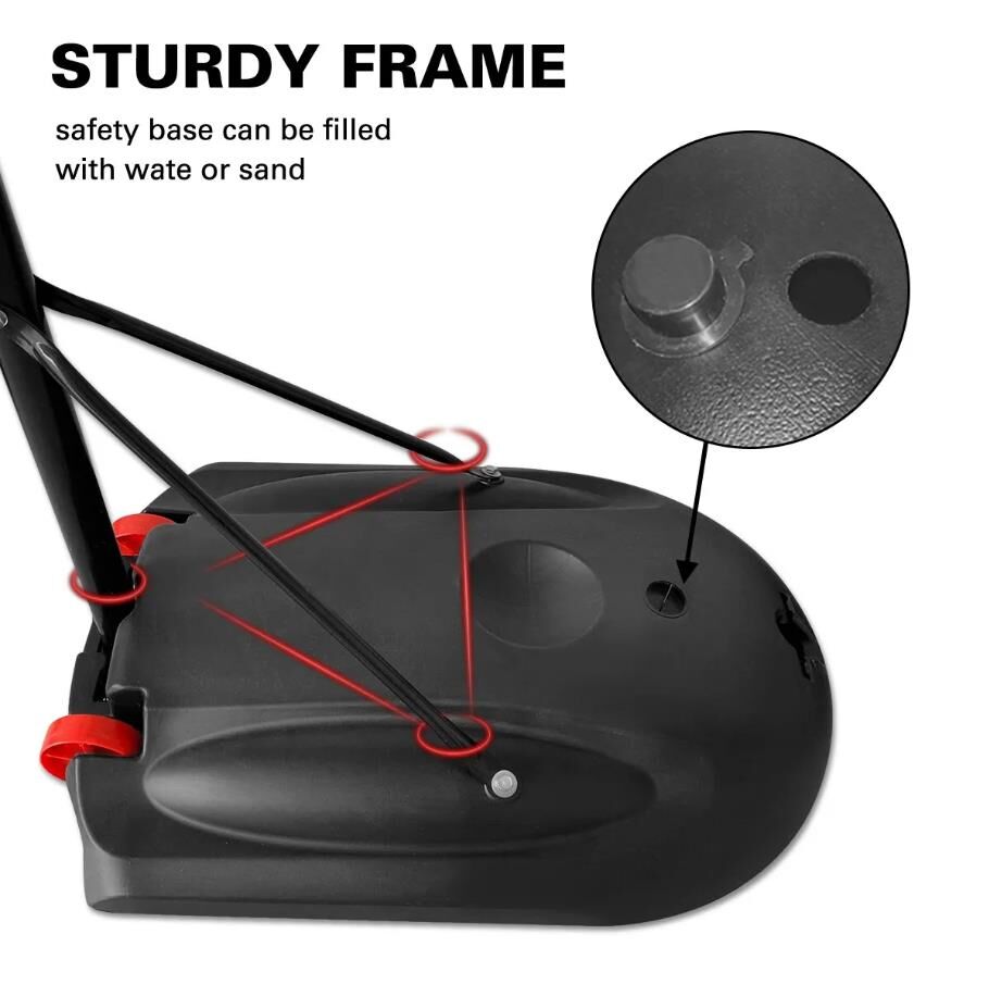 There is nothing better for anyone who loves to shoot hoops making basketball throws in the backyard or driveway whenever he likes. This Portable Adjustable Basketball Hoop Ring Stand System will not make you disappointed. Thanks to the telescopic design with an adjustable height ranging from 1.7m to 2.3m, the basketball hoop set is suitable for users of different ages and heights. To ensure easy maneuverability, the basketball set is built with smooth roller wheels. Crafted from high-quality materials with a powder-coated finish, this outdoor basketball hoop is completed with a UV-resistant basketball backboard, a steel rim, a nylon basketball net, round steel tubes, a durable base as well as welded steel net hooks. You can fill 95L water or sand in its base for added stability and safety. Easy to assemble, this basketball hoop and stand are rugged, weatherproof and rust-resistant for indoor and outdoor use.