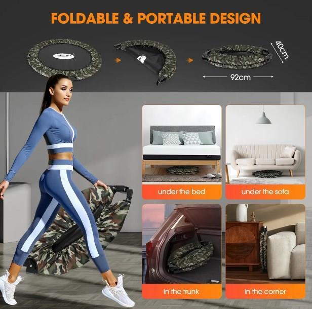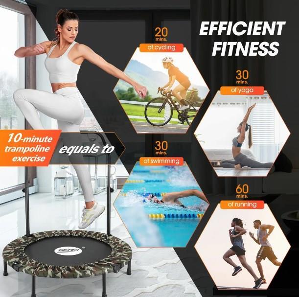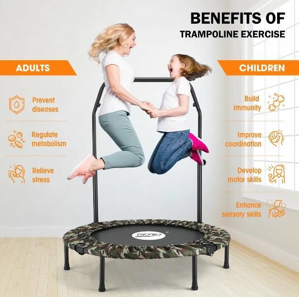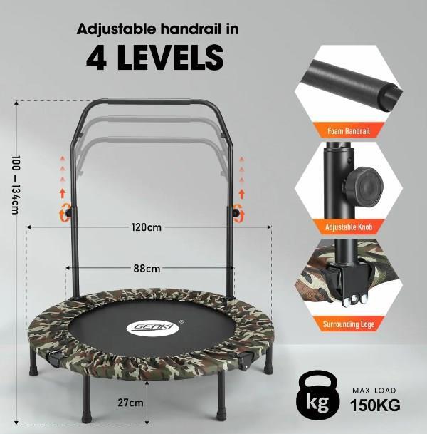 Not only does this Genki trampoline exercise your whole body, but it also helps strengthen your muscles and improve your health. Consisting of reinforced closed coil springs, the trampoline provides a secure and controlled bouncing workout while avoiding injury. Plus, it is equipped with strong stainless steel legs with skid-resistant rubber caps for extra steadiness and security. In addition, the Oxford surrounding edge is extended to cover all the gaps between the mat and the steel frame, giving you peace of mind and preventing incidental foot slips. Besides, the sturdy and durable PP jumping mat can withstand the rigours of regular use, from intense workouts to energetic play sessions. Better still, an adjustable handrail features four height levels to suit the needs of users of all ages and fitness levels.