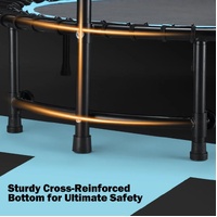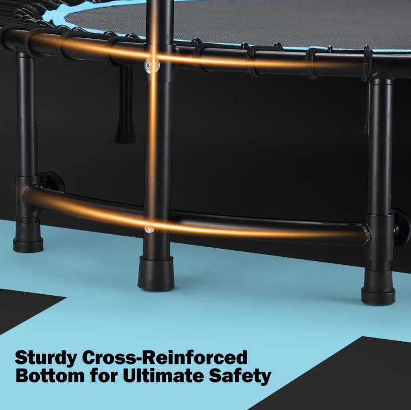 - Exercise Trampoline: It is made of heavy-duty steel and has six legs covered with anti-slid rubber caps. There is an ingenious washer inside the rubber leg cap that prevents the leg from cutting through the rubber cap due to frequent use and body weight pushing down on the metal leg caps, ensuring the trampoline reduces noise to the maximum extent, provides greater stability for safety, and protects the floor. The frame provides unmatched stability and won't tip over for added safety. From balance exercises to high-intensity training, it’s designed to help you reach your fitness goals.