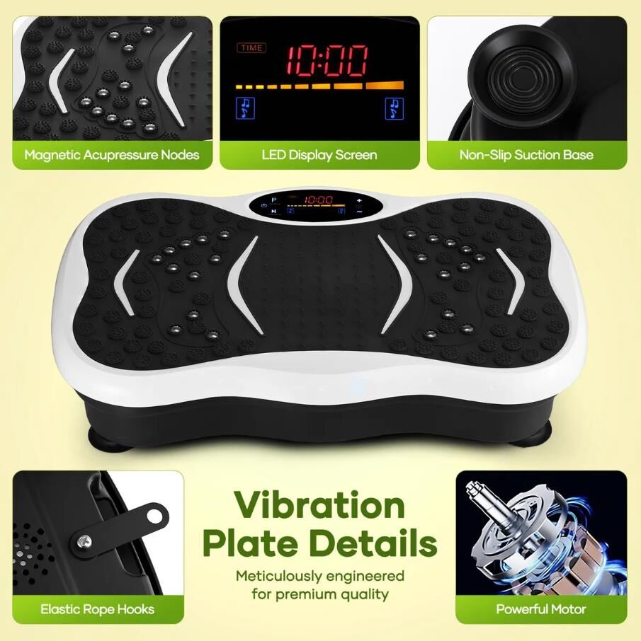 Increase your muscle tone, strengthen your joints, and optimise your whole-body workout with this Vibration Plate Exercise Machine Fitness Platform Vibrating Shaking Board for Men and Women. With 99 adjustable speed levels and a 150 kg weight capacity, this vibration machine delivers gentle yet effective vibrations that activate muscles, enhance blood flow, and improve calorie burn. The high-frequency vibrations stimulate deep muscle contractions, enabling faster fat loss and quicker attainment of your fitness goals compared to traditional cardio workouts. The slim equipment features remote and onboard controls, a clear LED display, a non-slip surface, and a durable ABS shell, making it ideal for use at home, in the office, or in small spaces. Moreover, four anti-slip suction cups ensure the machine stays firmly in place, minimising noise and guaranteeing a smooth, undisturbed workout experience.