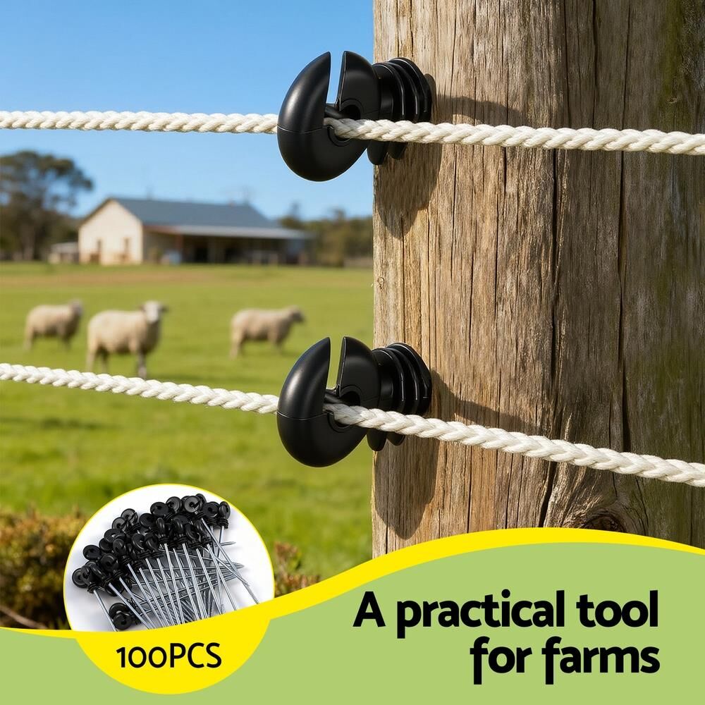 This Giantz electric fence kit includes 100pcs electric fence insulators, essential for any electric fencing setup. These electric fence pinlock insulators provide good insulation for secure attachment. Made from high-strength, UV-resistant PP, they are built to withstand Australian conditions. They are versatile and suitable for wire, polywire, rope, and electric fence tape, functioning effectively as start, end, corner, or line insulators.