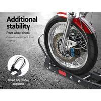Transport your motorcycle with confidence with the Giantz Motorcycle Carrier. With its 2'' hitch mount, the carrier is compatible with most hitch receivers. Featuring heavy-duty steel construction, the carrier can carry up to 227kg (500lbs) with minimum hassle. It is also designed to enable steady and firm transport with a close-fitting front tyre channel, anti-tilt holder and front wheel chock. Both the tilt-holder and front wheel chock can be adjusted with three available positions. The loading ramp also enables easy up and down and be used either side. Not least, the carrier can also be used for cars with their tyres backed up onto the carrier.