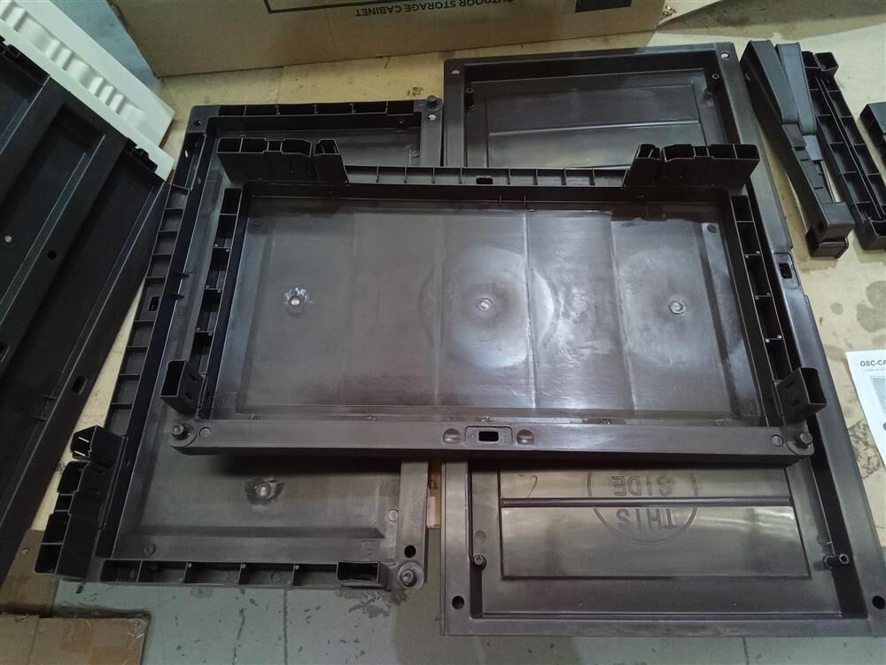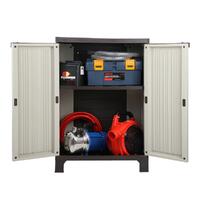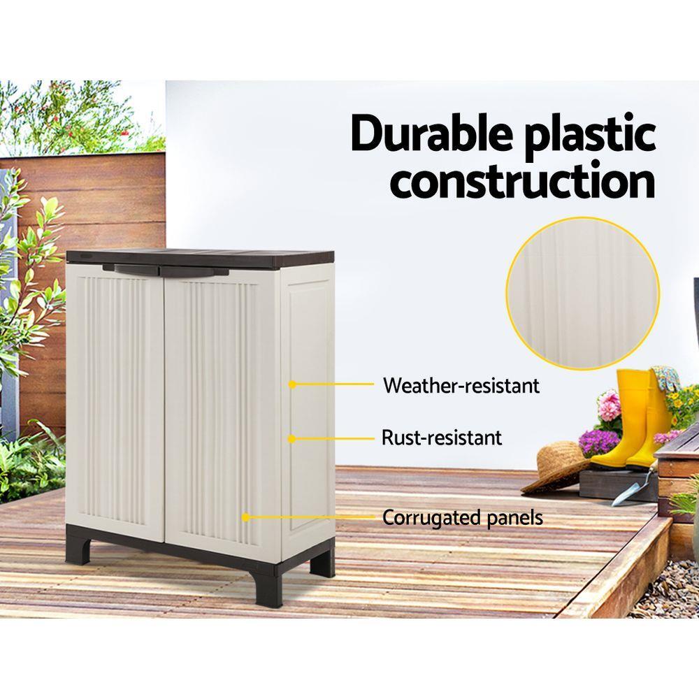 Outside, it shares similar attributes of the full-size cabinet with the same corrugated panel design for added support and style. The weather-resistant premium plastic construction ensures longlasting use while the stilted feet protects it against spills, floods or wet ground. No worries there of where you want to place it.