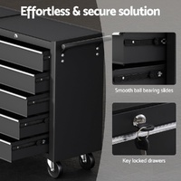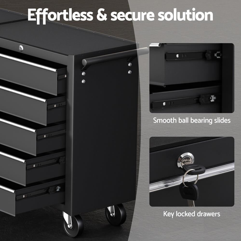 This robust, multi-drawer Giantz Tool Trolley is an essential for any workshop. Crafted from durable steel, it features smooth ball-bearing slides for easy access and a secure lock system for safety. Its spacious design includes varying drawer sizes to accommodate tools of all shapes, complete with non-slip liners. The chest is also mounted on omni-directional castors with locakble front wheels, ensuring a smooth maneuverability and stable positioning. Sleek and functional, it's perfect for organizing and protecting your valuable tools.